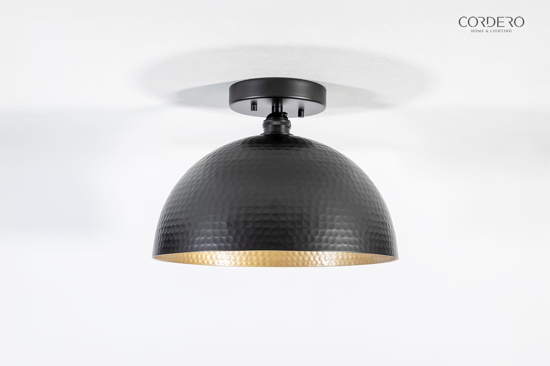 Elevate your space with the bold sophistication of our Black Hammered Dome Semi-Flush Mount. Handcrafted with a textured matte black exterior and your choice of ten stunning interior finishes, this fixture brings dramatic style and warm ambience to any room.
