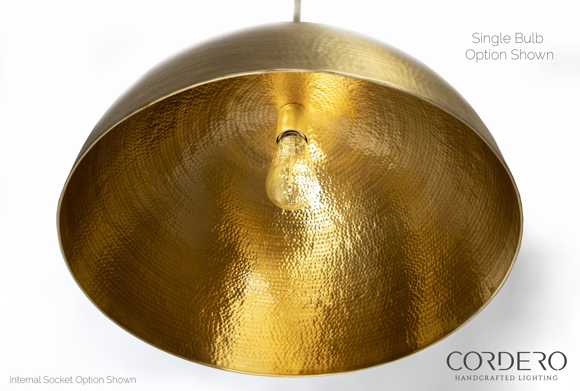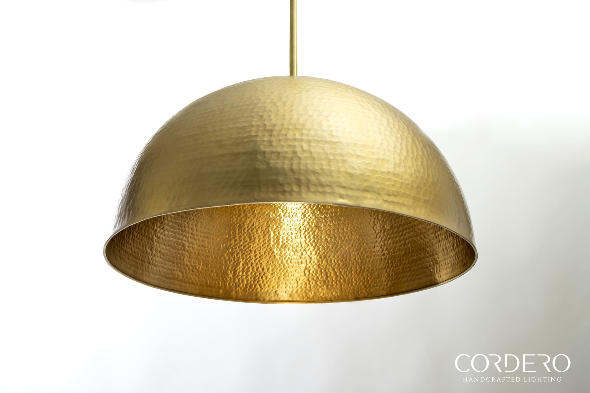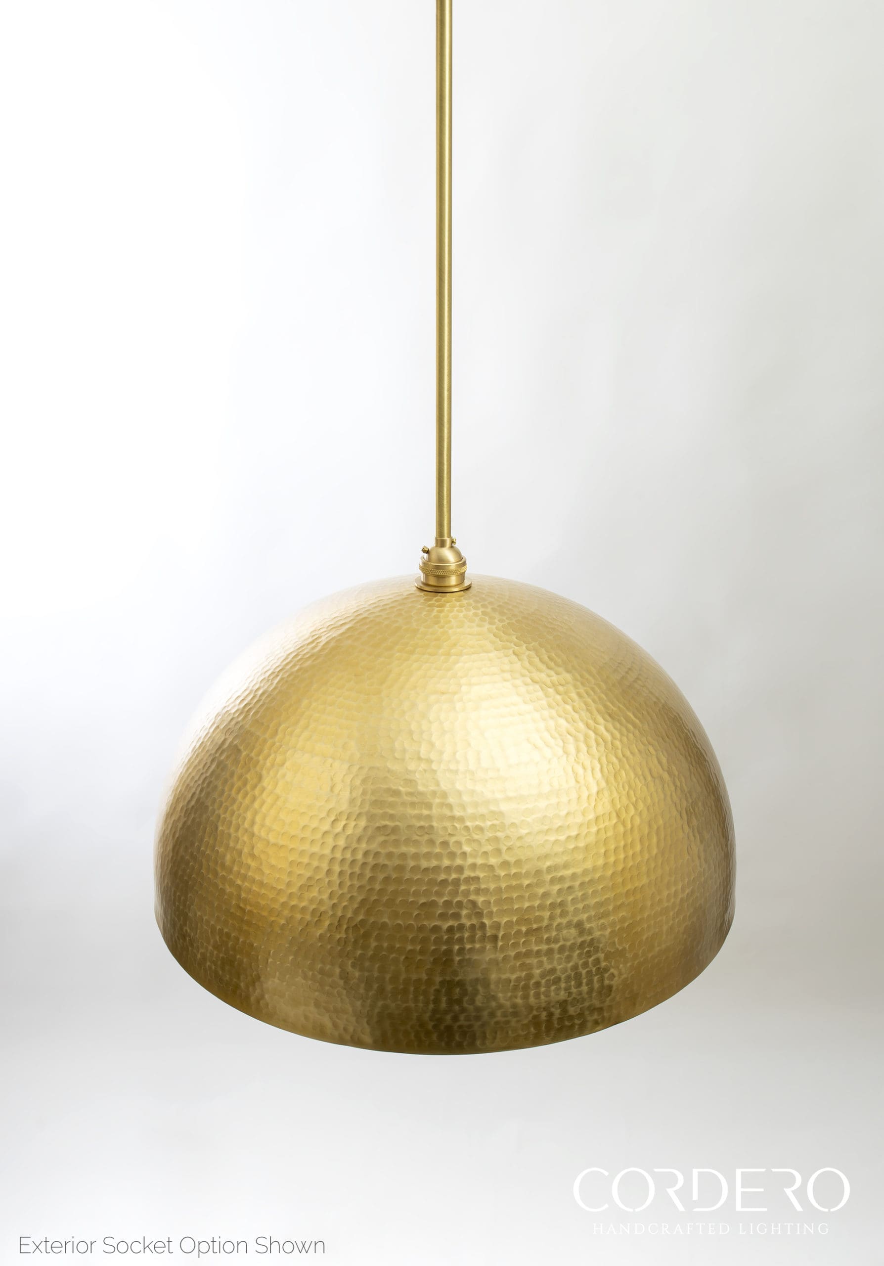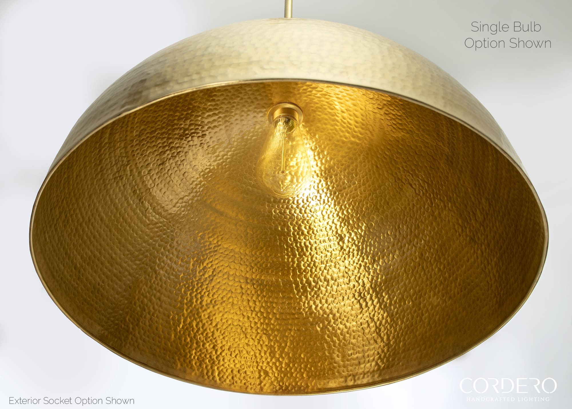 Crafted from solid brass and hand-finished by our skilled artisans, the Brushed Brass Hammered Dome Pendant brings timeless sophistication to any space. Each dome features hundreds of individually hammered dimples, creating a richly textured surface that softly reflects light—adding warmth, depth, and dimension. Unlike plated finishes, solid brass offers unmatched durability and authentic character. If left unmaintained, the brass will naturally age over time, developing a rich, organic patina that enhances its uniqueness. To maintain its original shine, occasional polishing is recommended—offering an easy way to preserve its golden glow with minimal upkeep. With its seamless balance of industrial form and elevated material, this pendant is designed to be a focal point in high-style kitchens, elegant dining spaces, or refined commercial interiors. More than just a light fixture, it’s a sculptural statement that evolves with your space.