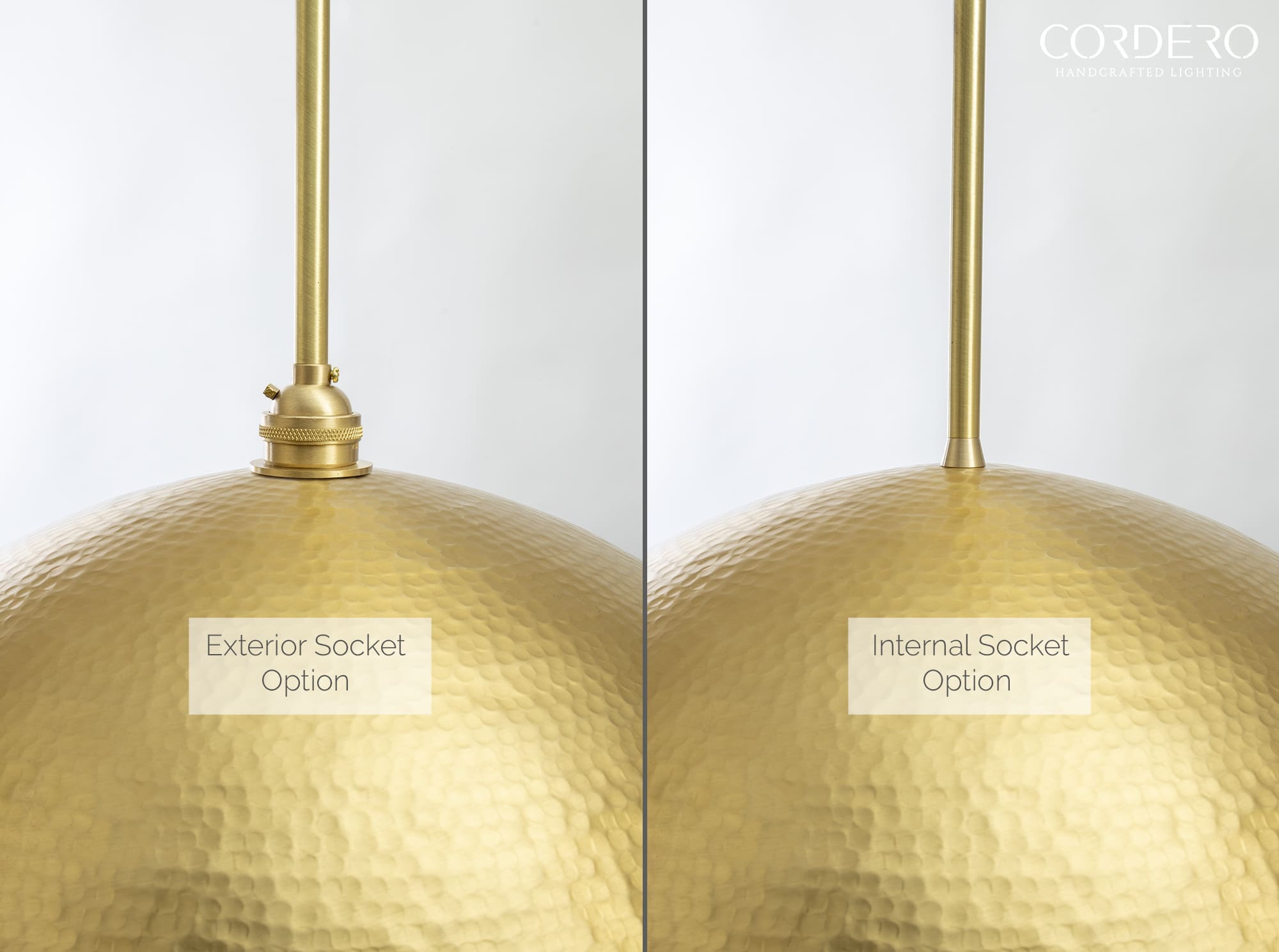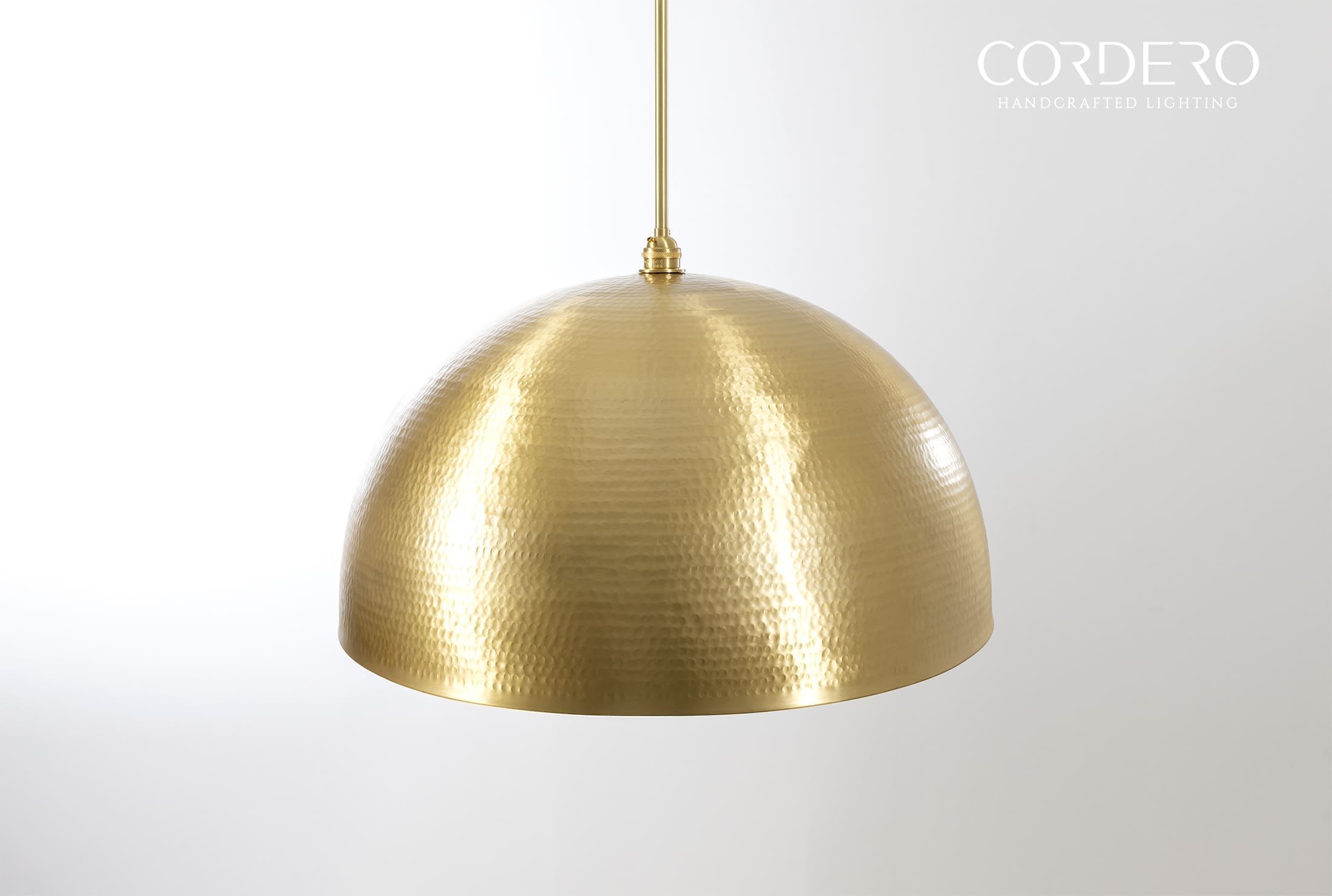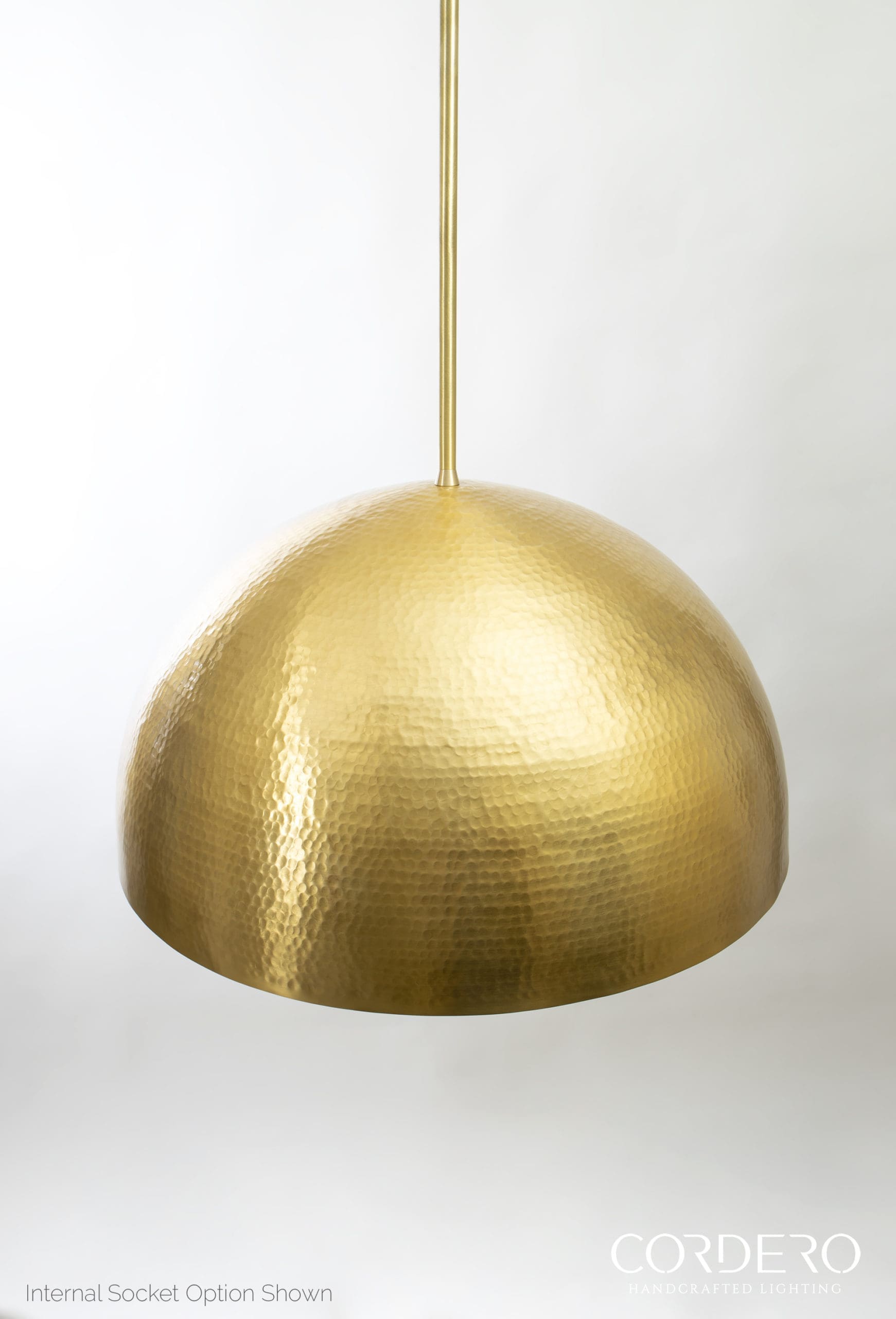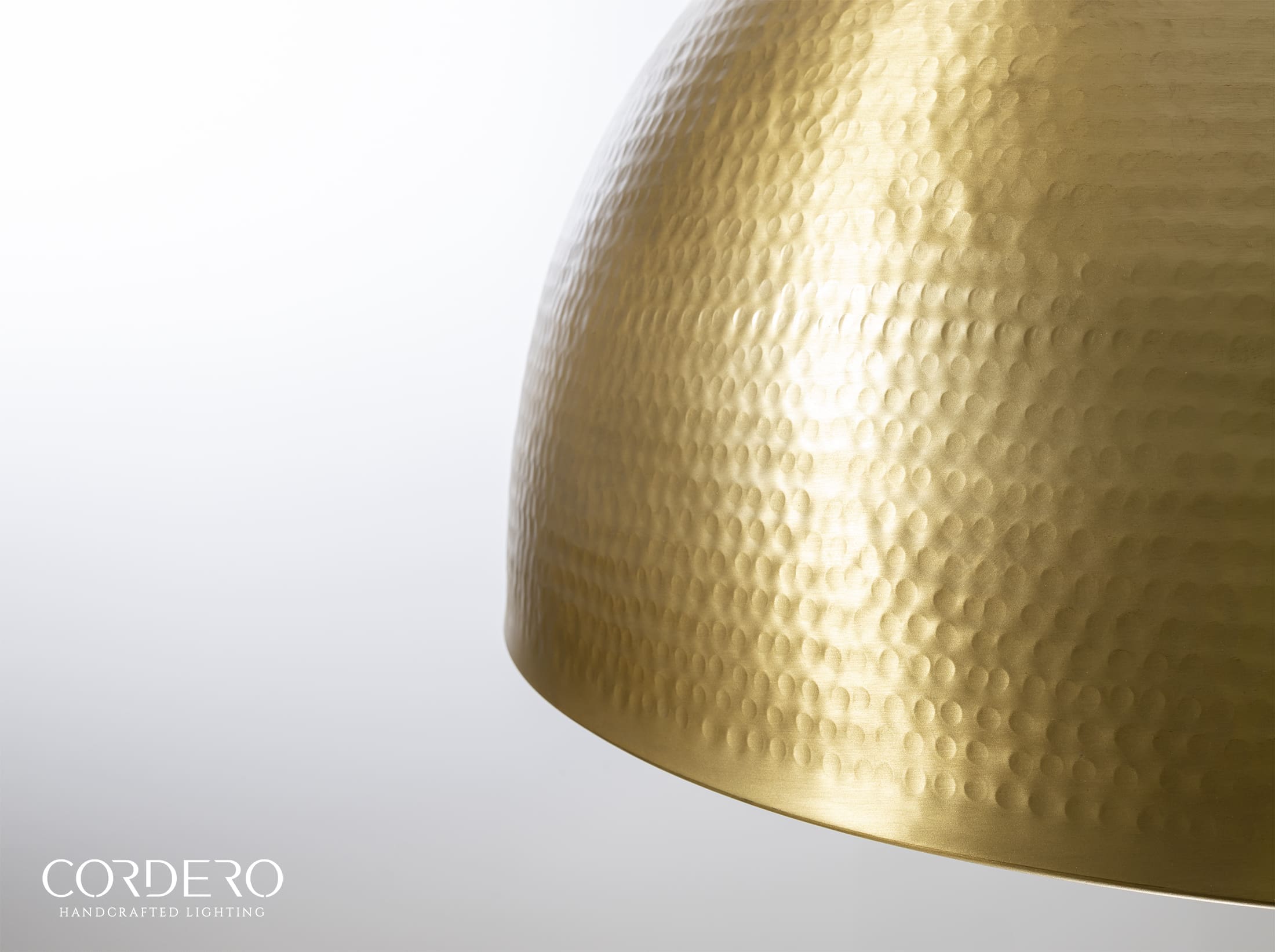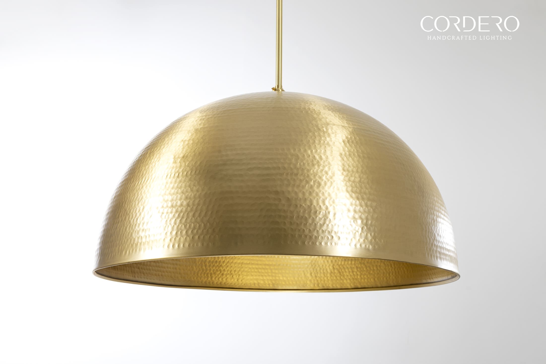 Crafted from solid brass and hand-finished by our skilled artisans, the Brushed Brass Hammered Dome Pendant brings timeless sophistication to any space. Each dome features hundreds of individually hammered dimples, creating a richly textured surface that softly reflects light—adding warmth, depth, and dimension. Unlike plated finishes, solid brass offers unmatched durability and authentic character. If left unmaintained, the brass will naturally age over time, developing a rich, organic patina that enhances its uniqueness. To maintain its original shine, occasional polishing is recommended—offering an easy way to preserve its golden glow with minimal upkeep. With its seamless balance of industrial form and elevated material, this pendant is designed to be a focal point in high-style kitchens, elegant dining spaces, or refined commercial interiors. More than just a light fixture, it’s a sculptural statement that evolves with your space.