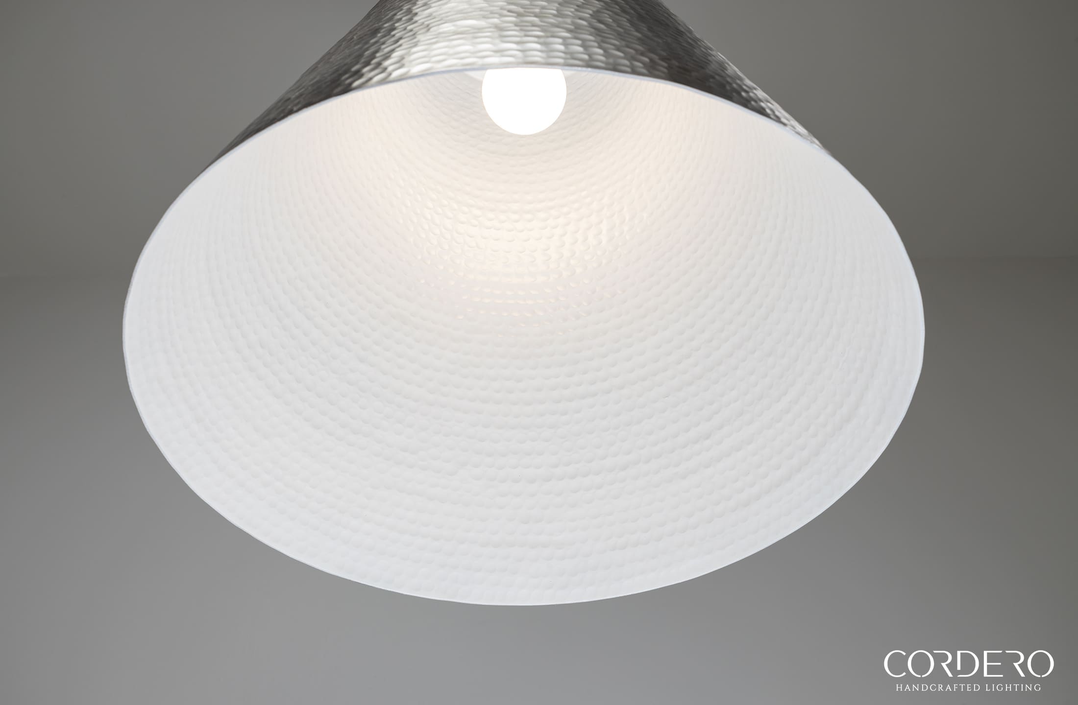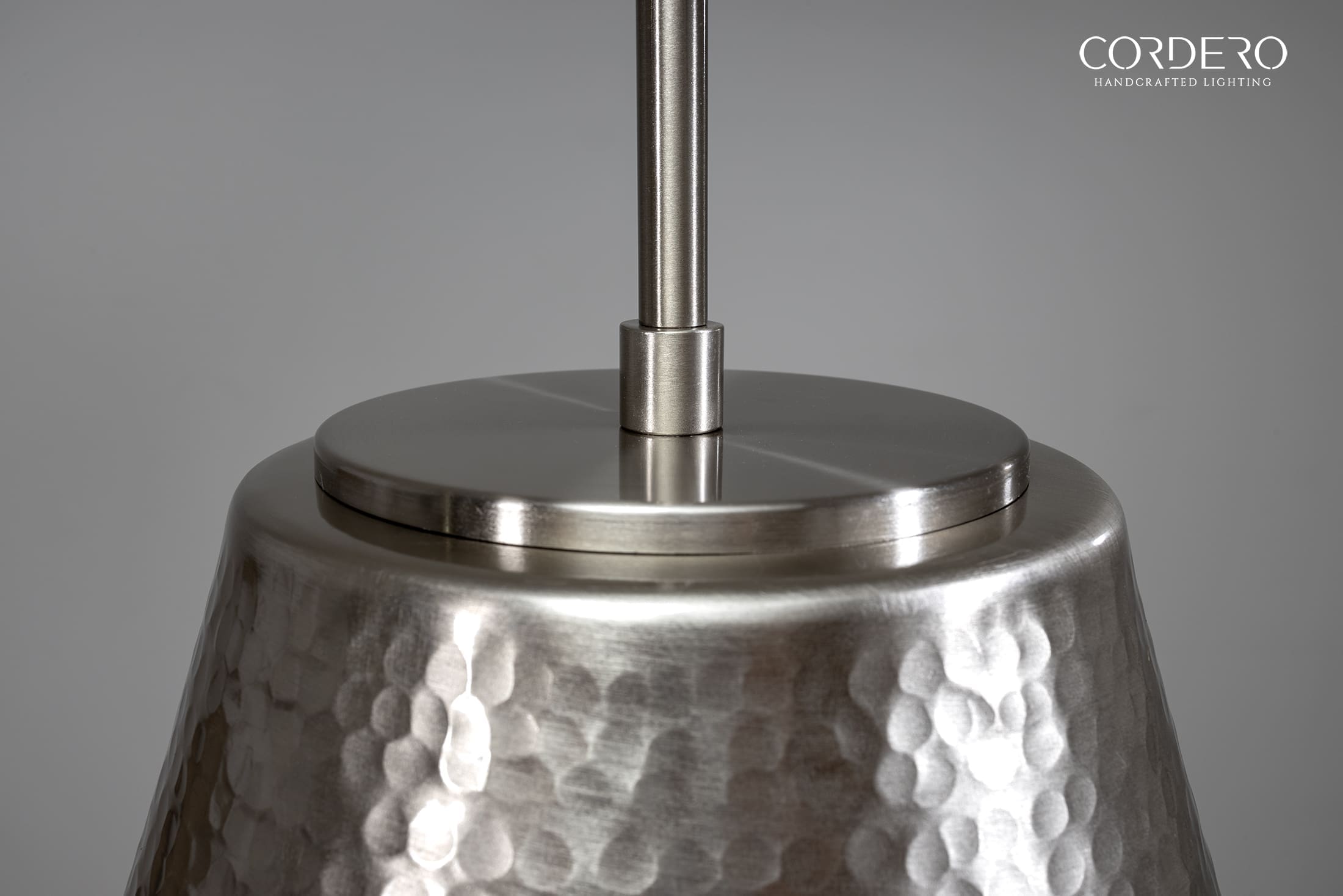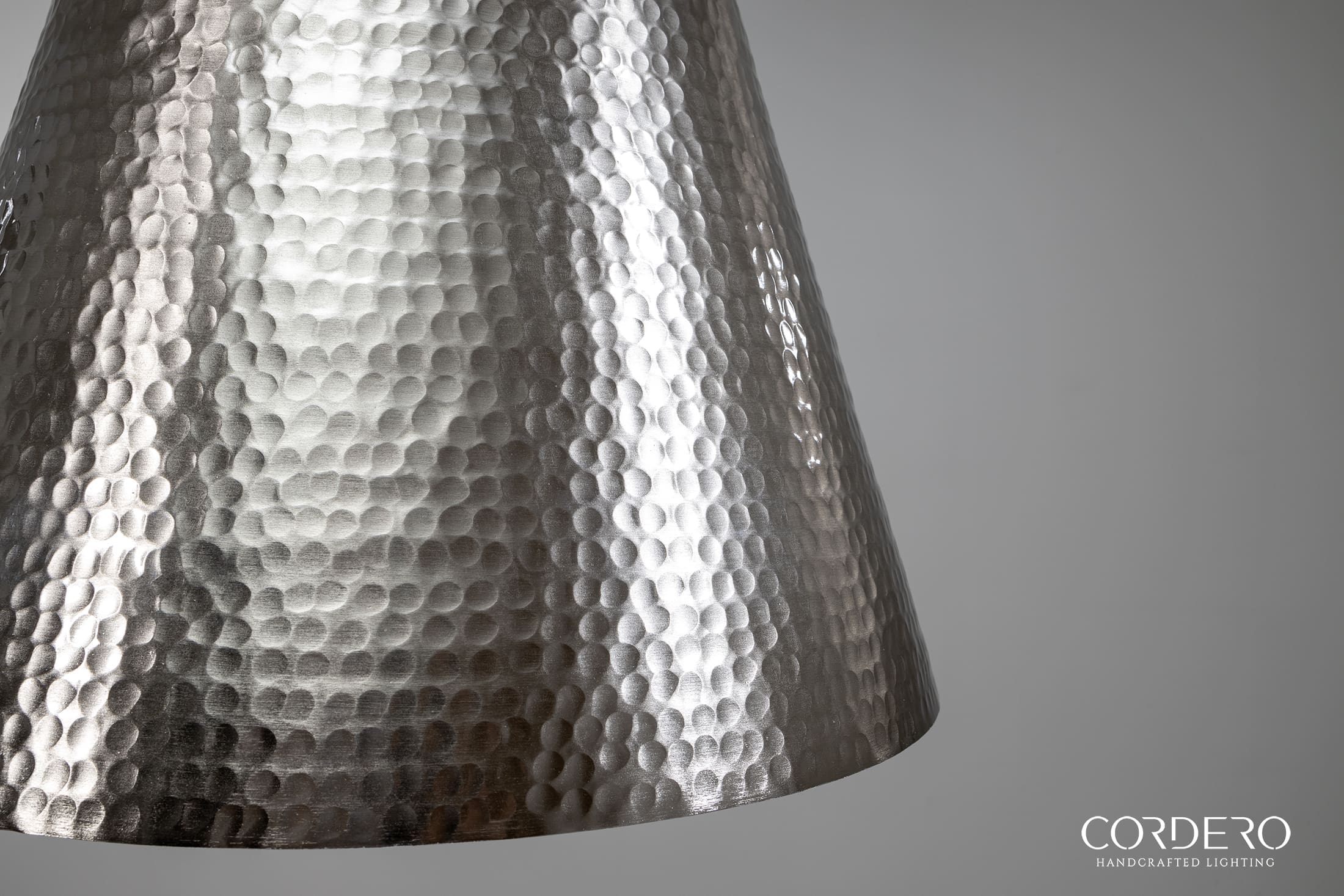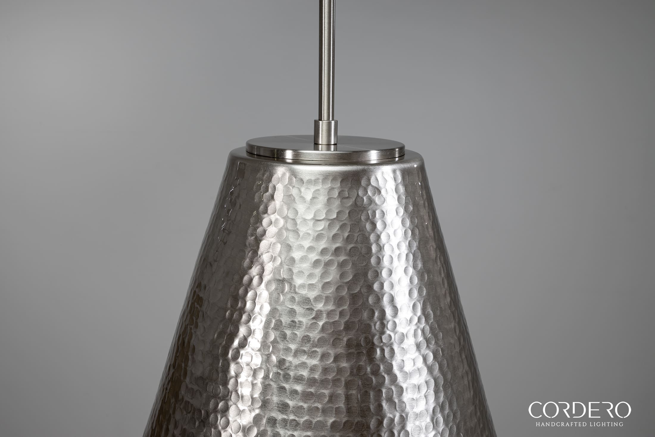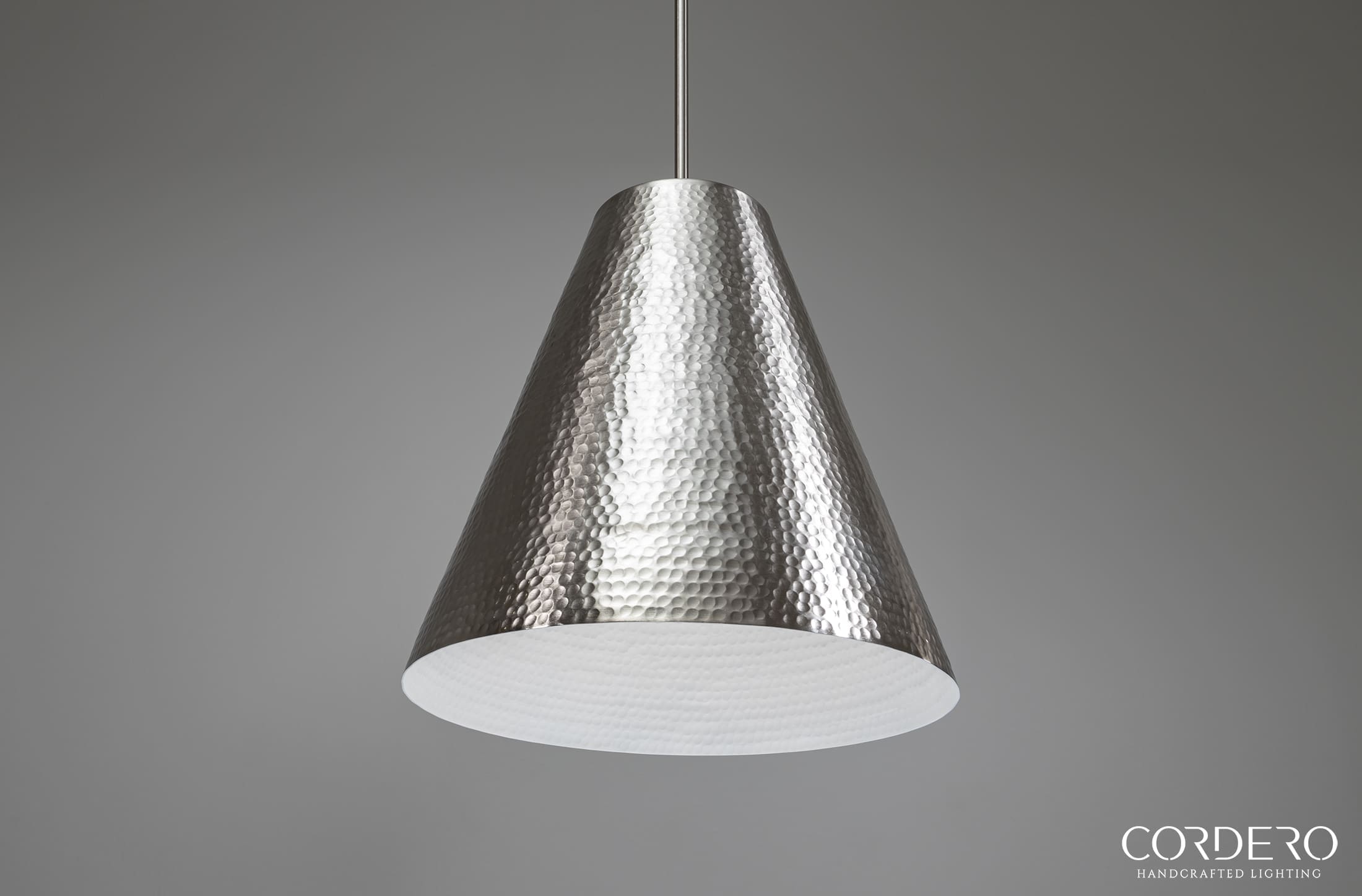 Our handcrafted Brushed Nickel Hammered Kinsmore Cone Pendant Light features hundreds of small hand-hammered dimples around an elegant 16” cone-shaped metallic shade. Perfect for displaying solo or in a series, the Brushed Nickel Hammered Kinsmore Cone Pendant Light suspends from a handcrafted canopy and metal rod radiating a rich glow over a kitchen island, bar, dining space and more. With over five choices in interior and hardware finishes, the Hammered Kinsmore Cone Pendant Light beautifully complements any home or business space.