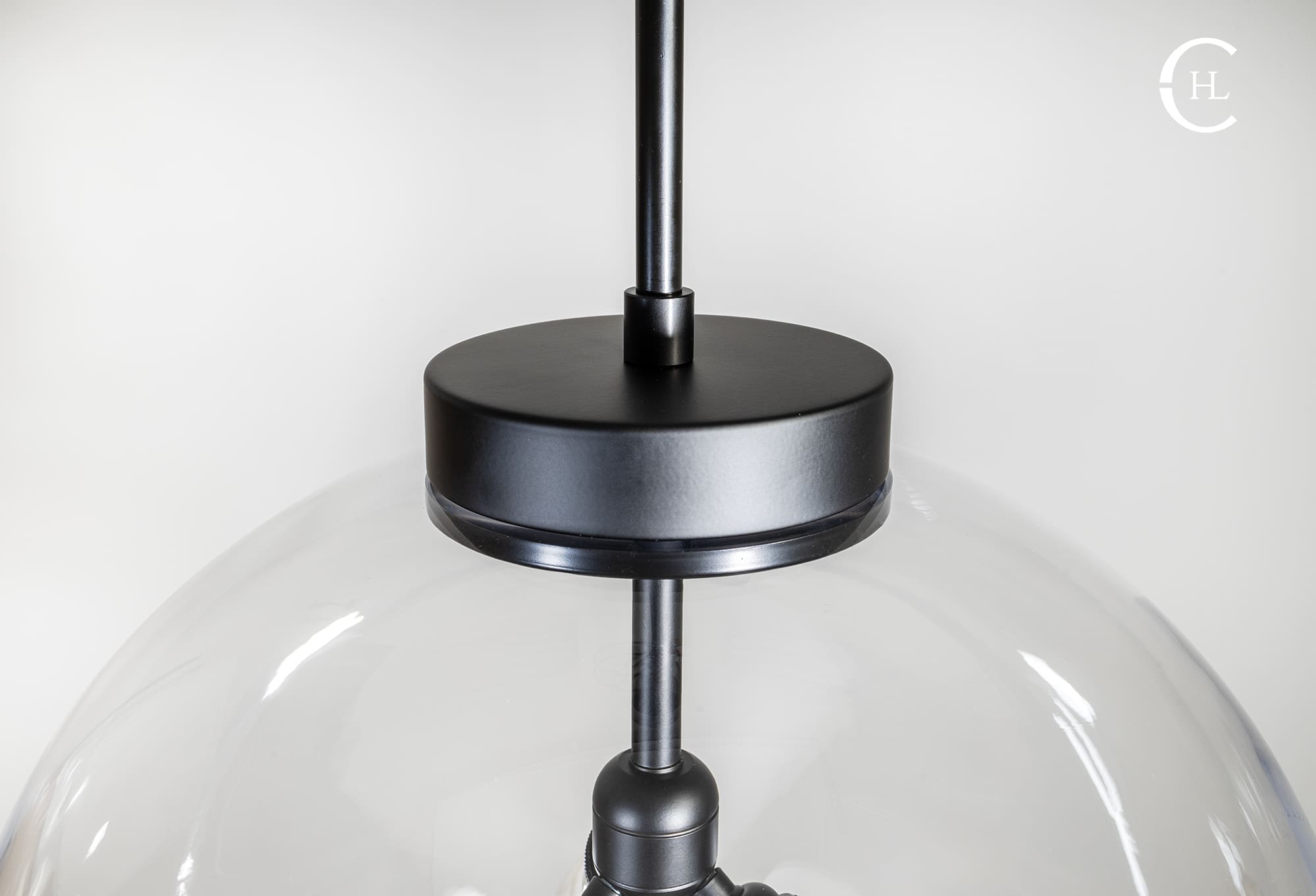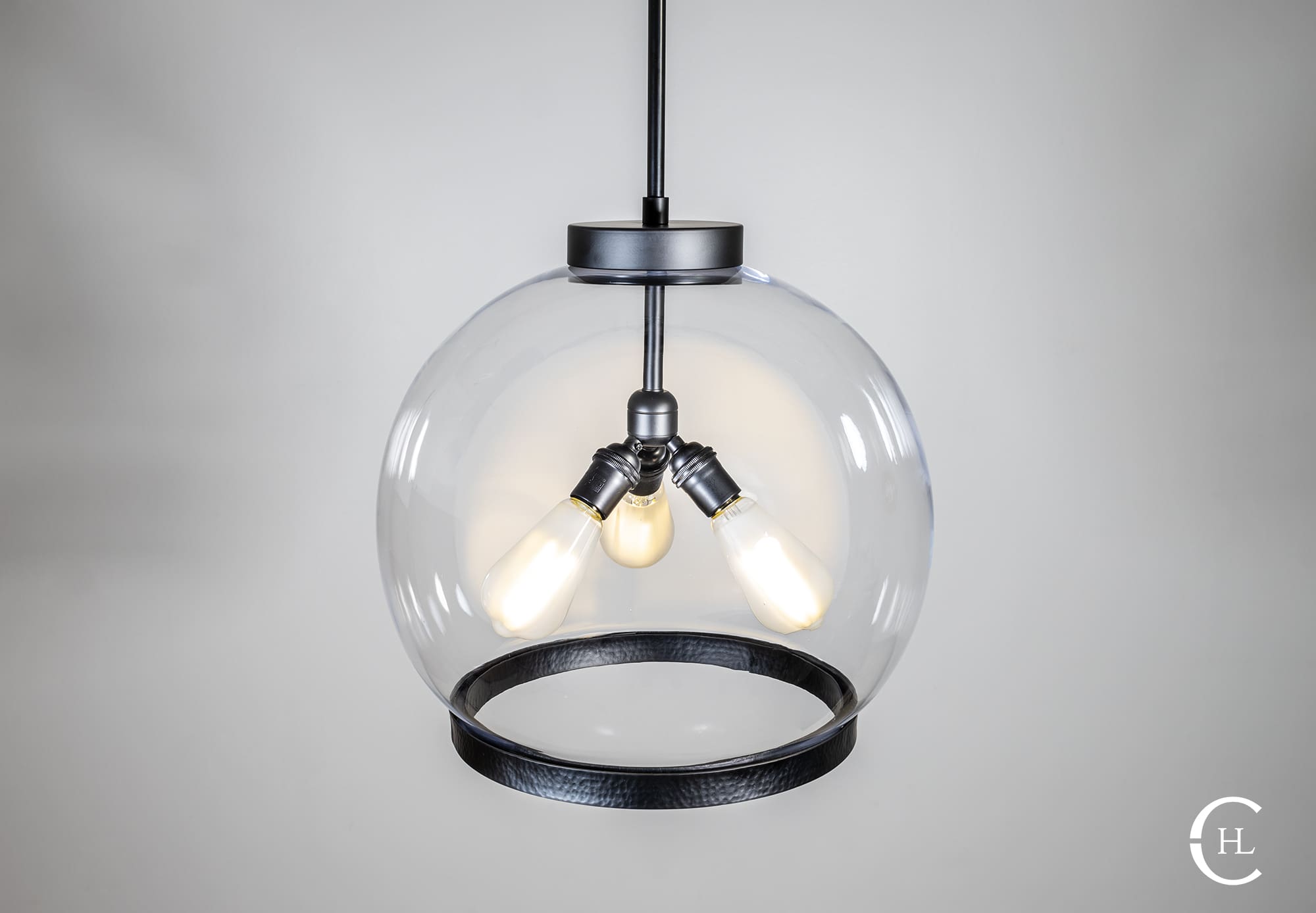 Our handcrafted Centerra Hammered Ring Globe Pendant delicately balances the smooth contours of our signature clear glass globes with the strength and texture of its metallic hammered border. In a series or as a single pendant, the 16” Centerra Hammered Ring Globe envelops a single bulb or tri-bulb that disperses light over kitchen islands, dining tables, entry ways and more creating a stunning industrial-elegant centerpiece.
