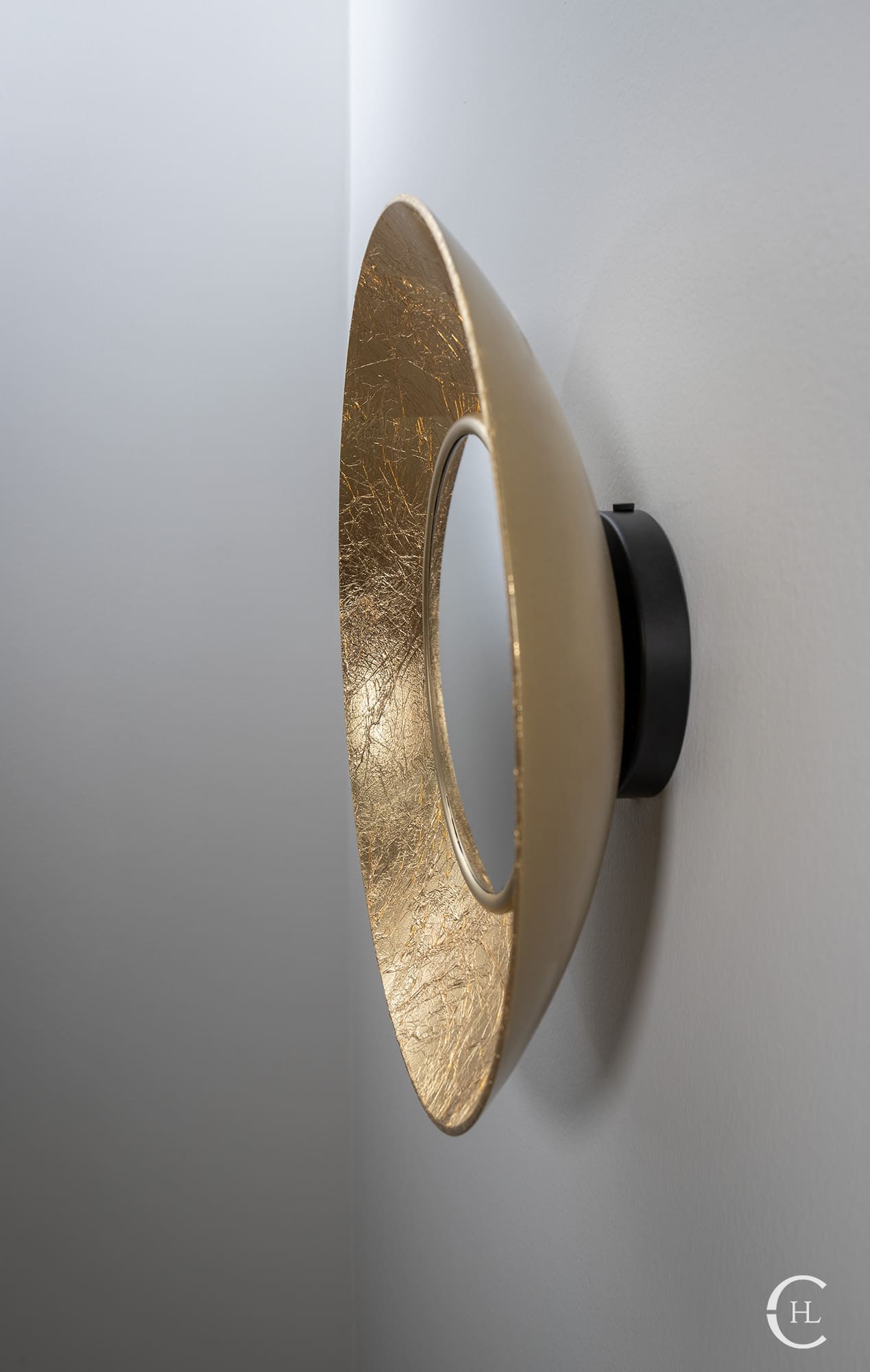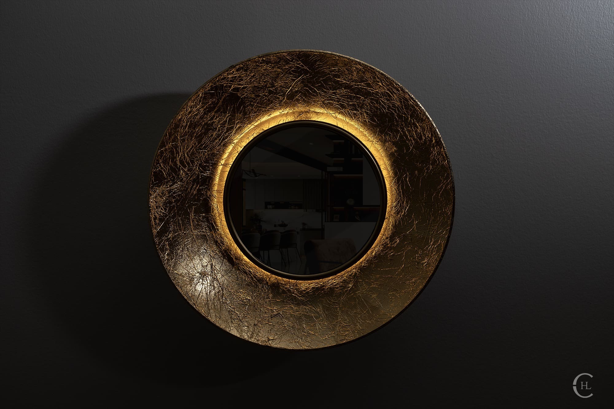 Immerse your space in the allure of a lunar eclipse with the Ciel Gold Leaf Lit Mirror. Carefully crafted, the sphere features delicate gold leaf sheets meticulously hand-placed to create the full moon’s silhouette. Backlit with LED lights, the mirror emits a celestial glow, revealing subtle lines of light when turned on. Ideal for wall art or creating ambience, this sconce adds celestial elegance to any room. Whether hung individually or in a group for a stunning wall art installation, the Ciel Gold Leaf Lit Mirror transforms your space into a haven of celestial charm.