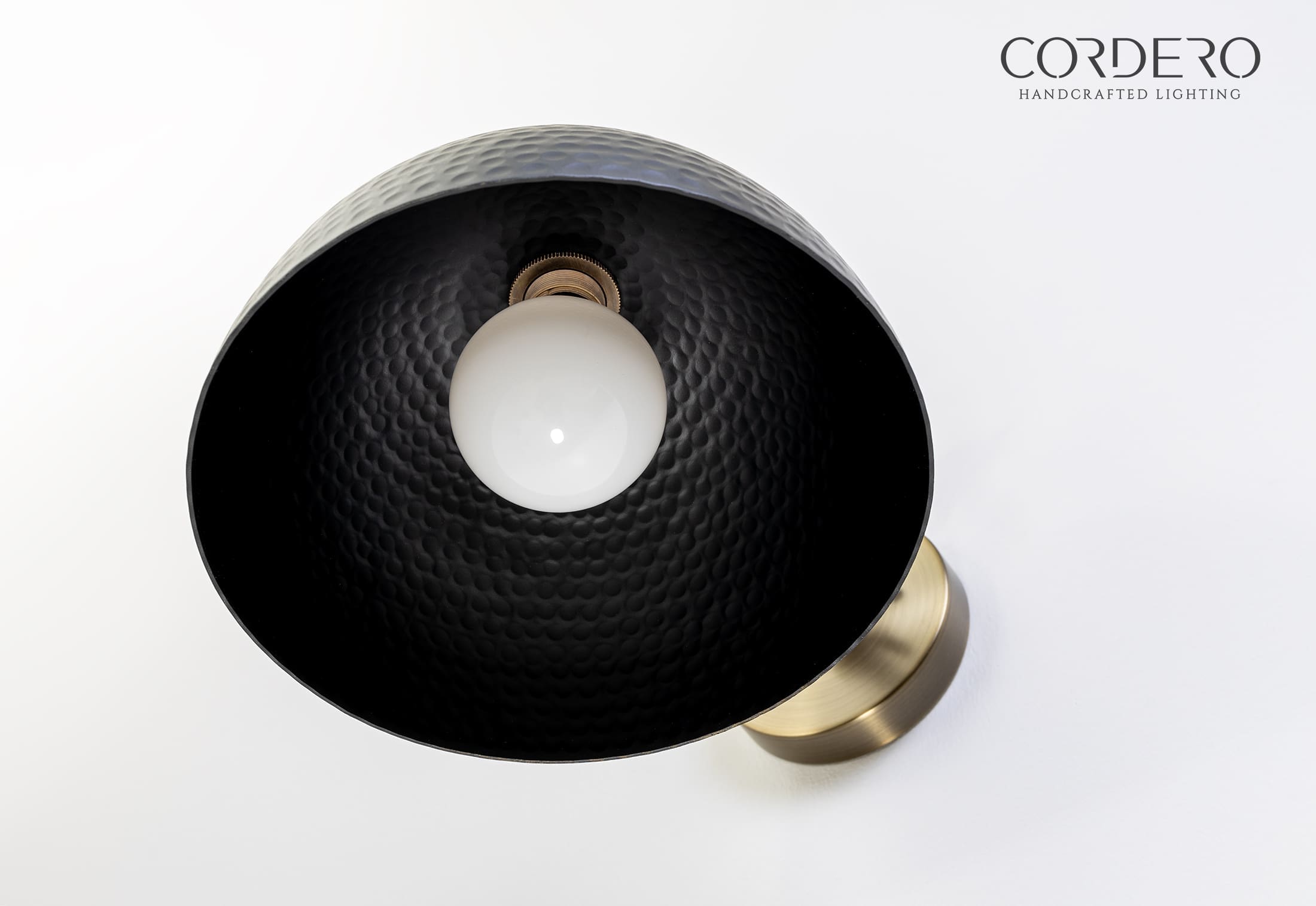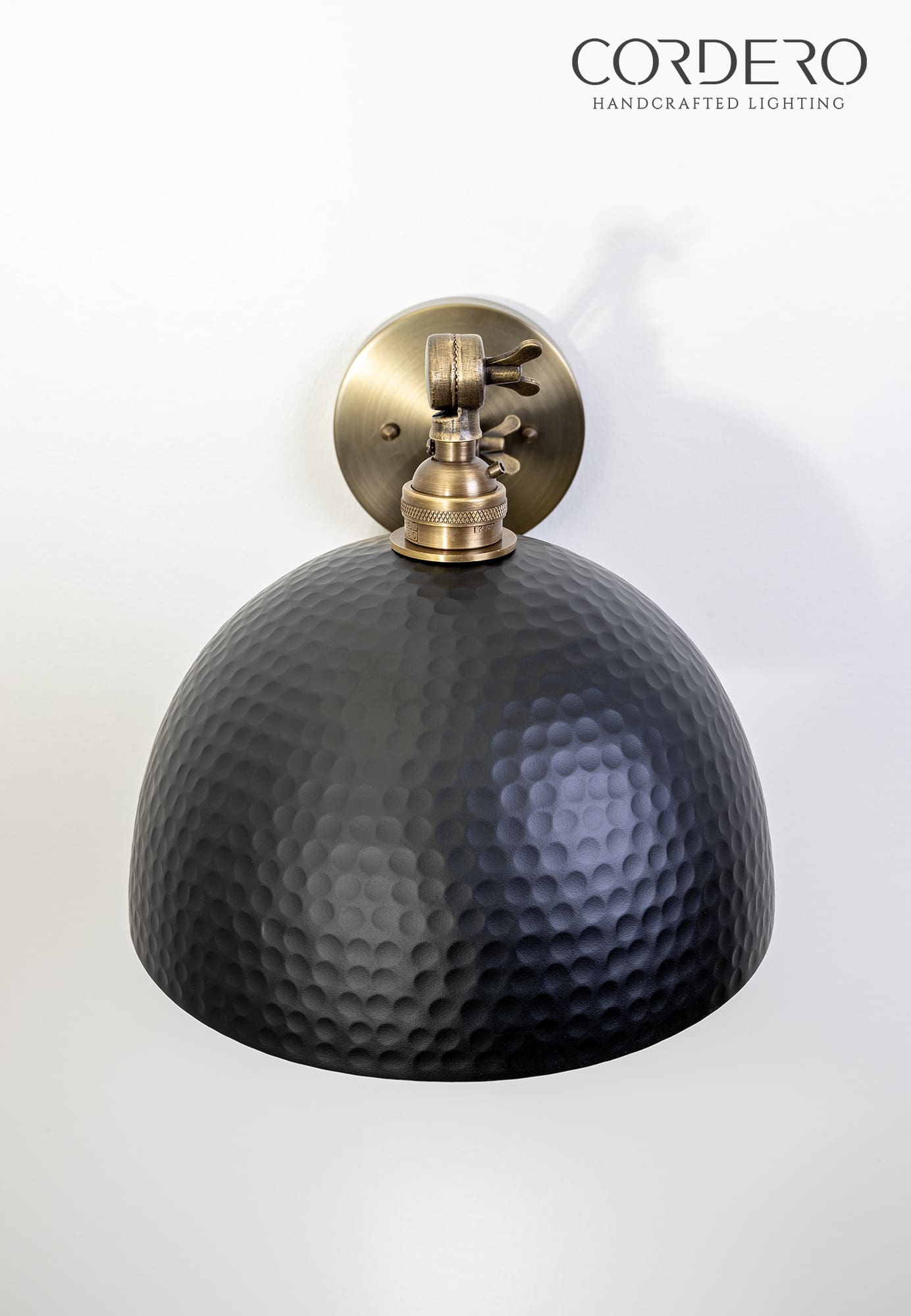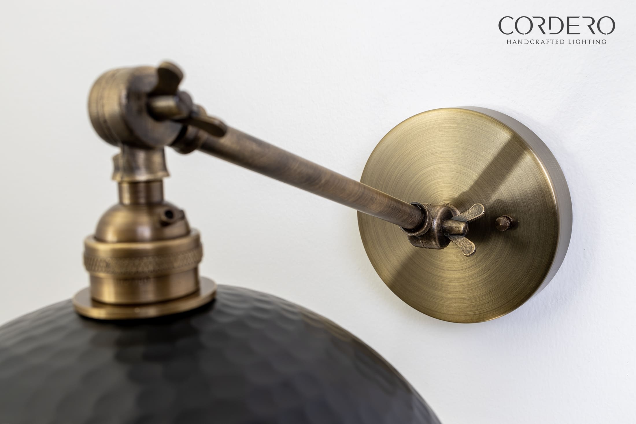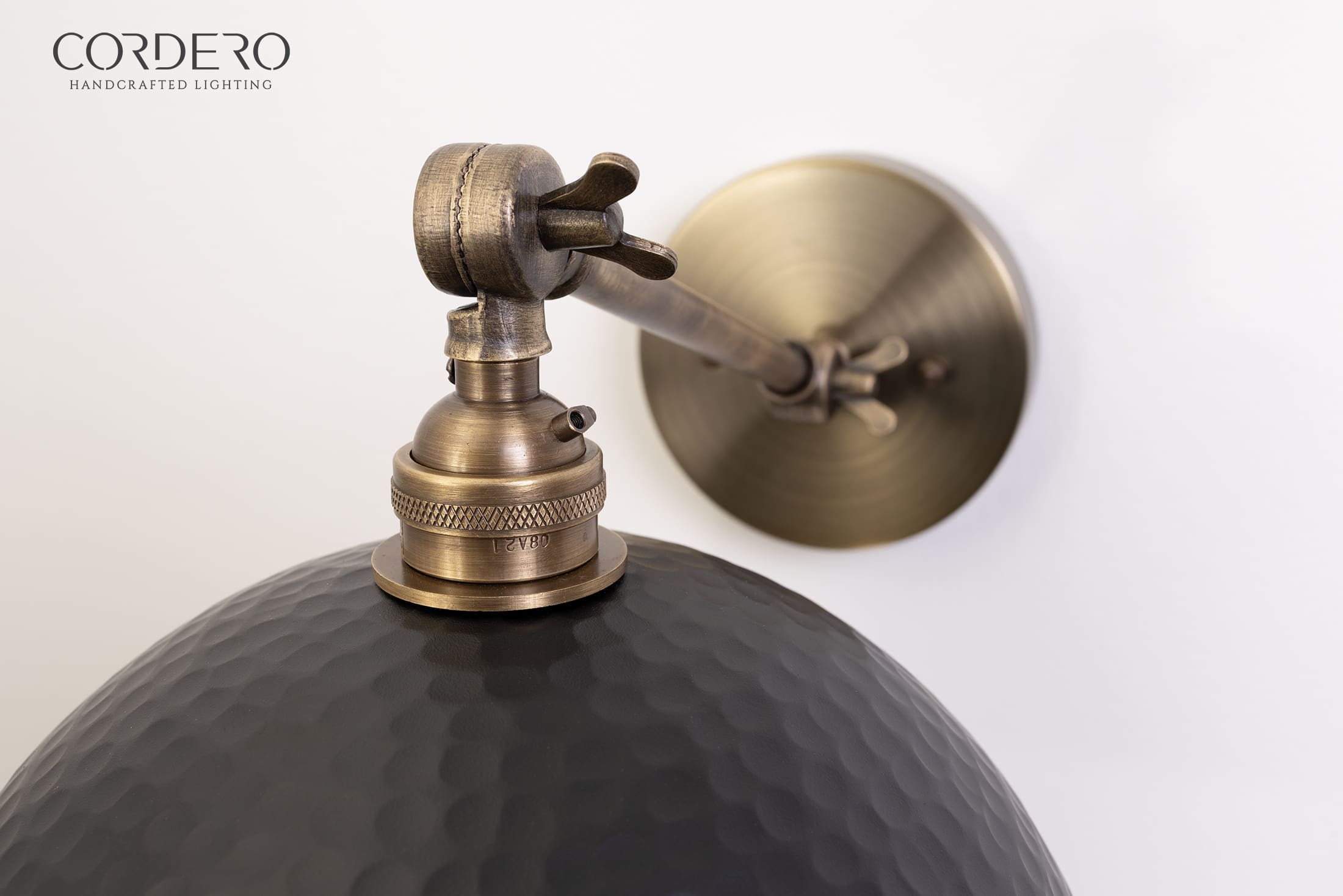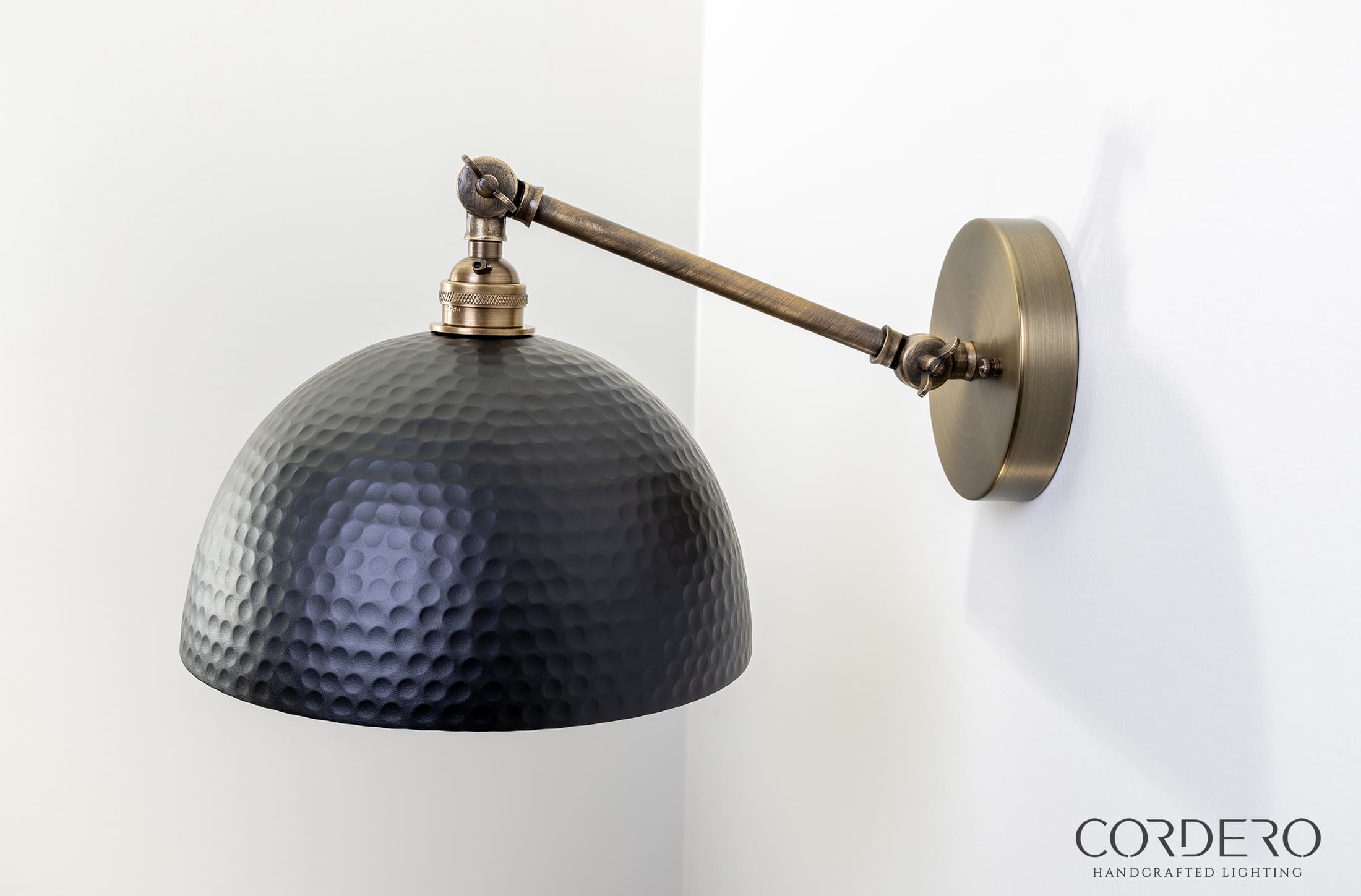 Marked with industrial and contemporary elegance, the Corvo Articulating Hammered Dome Sconce bathes your space in luminous sophistication. Whether you’re incorporating simple updates or doing a full remodel, the Corvo Articulating Hammered Dome Sconce looks as good over a bathroom mirror as it does over a night stand, office desk or bed frame. Equipped with keyed swivels at the canopy and above the shade, the articulating arm can rotate independently to offer the best positional lighting for your tasks. And the real secret to the Corvo’s stately presence…its incredible range of customizable finishes! From finish options for the brass or steel supporting rods, the 10” dome interior and exterior finishes and even three bulb choices, there’s a style arrangement to energize a wide range of design palates.