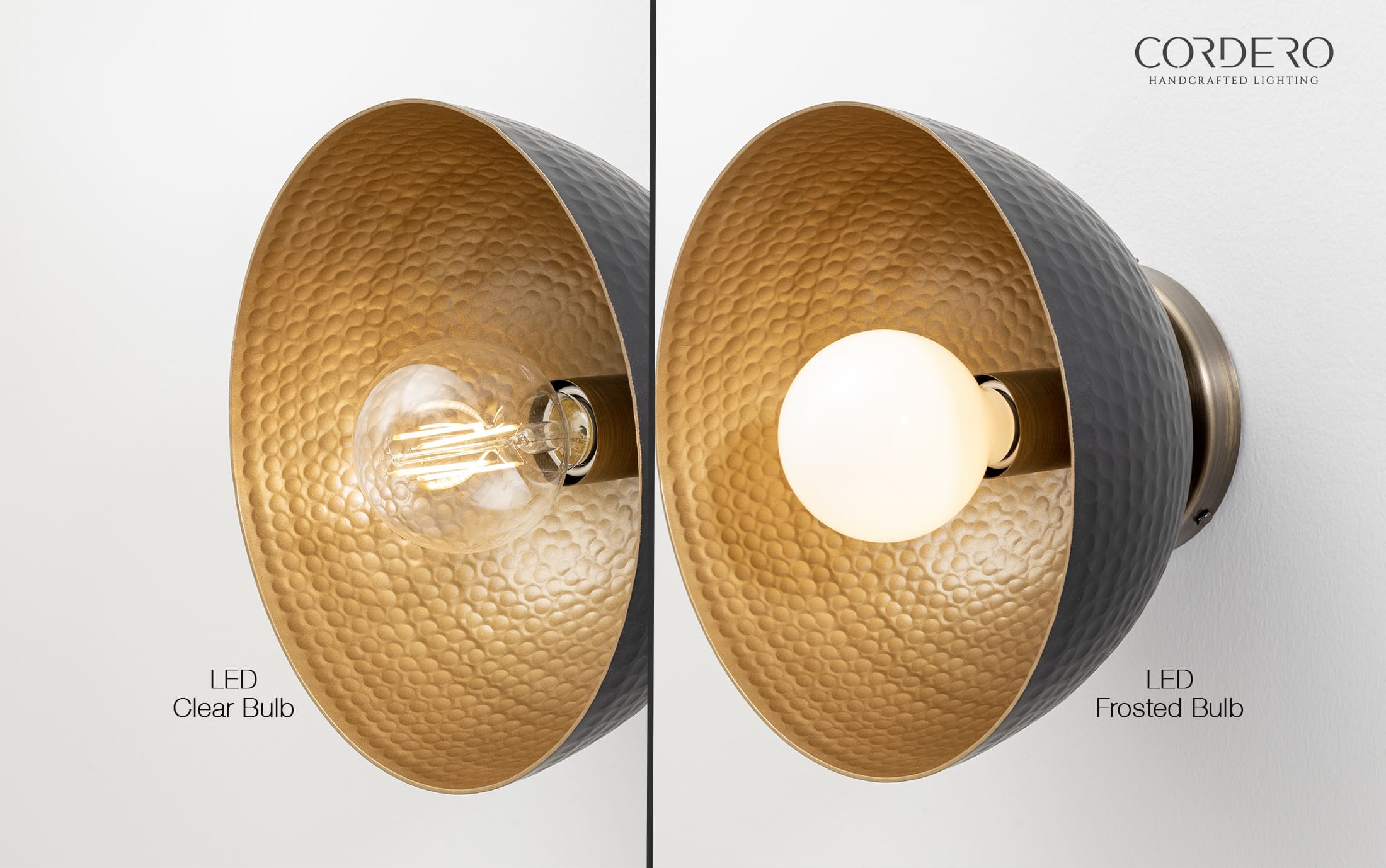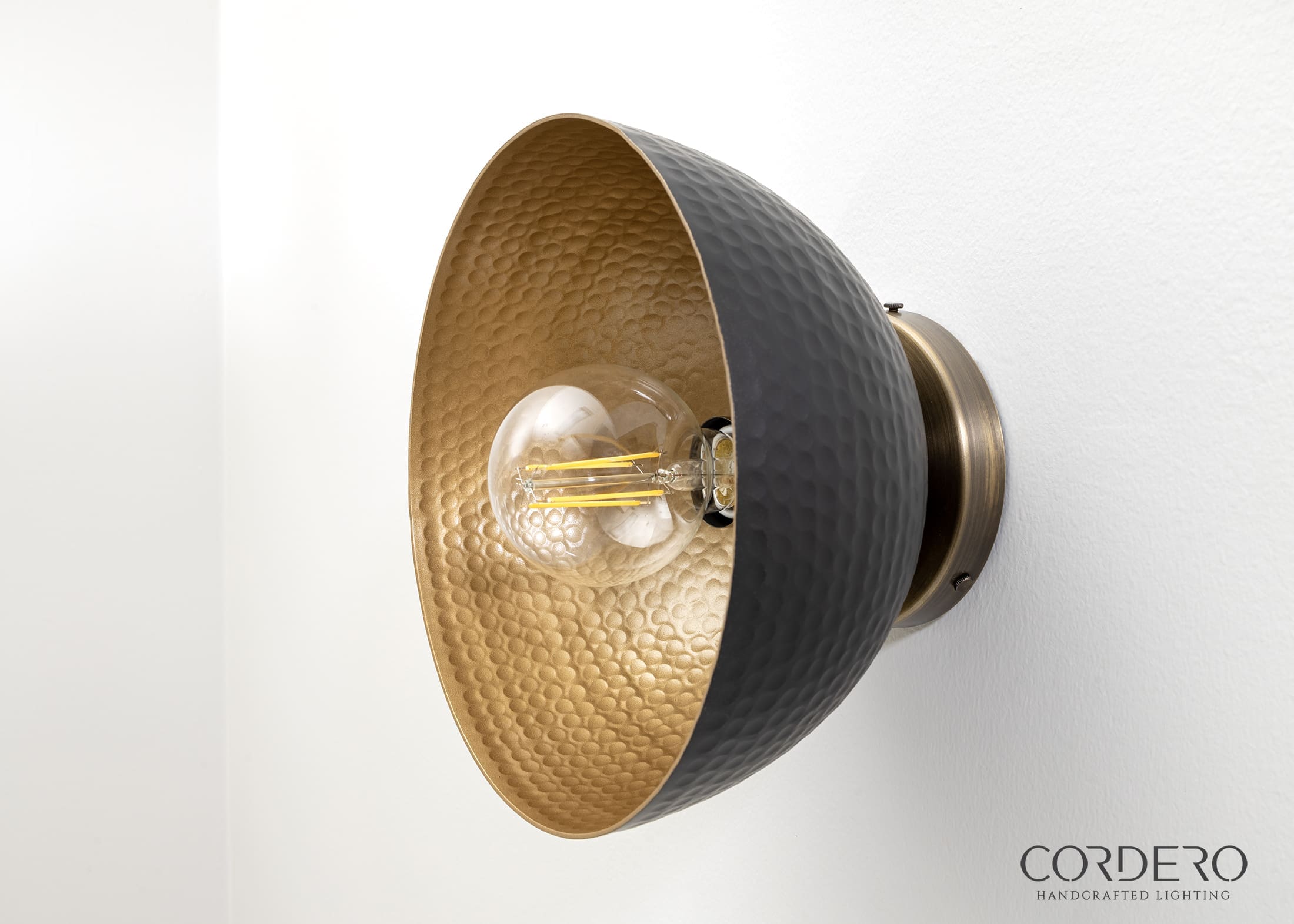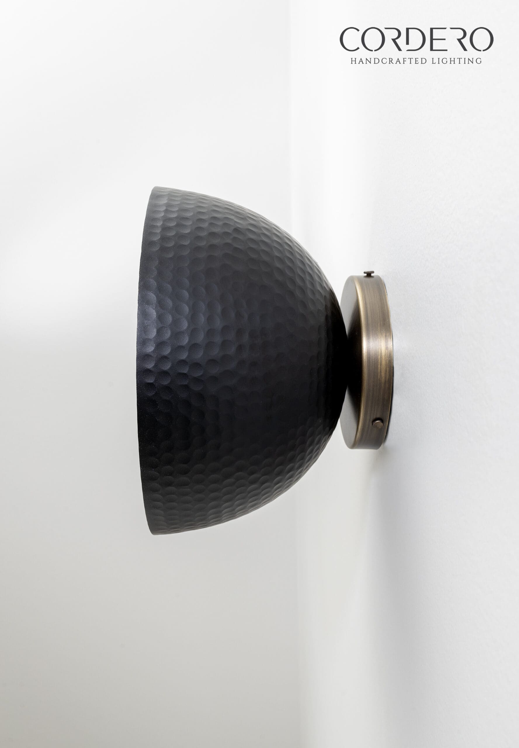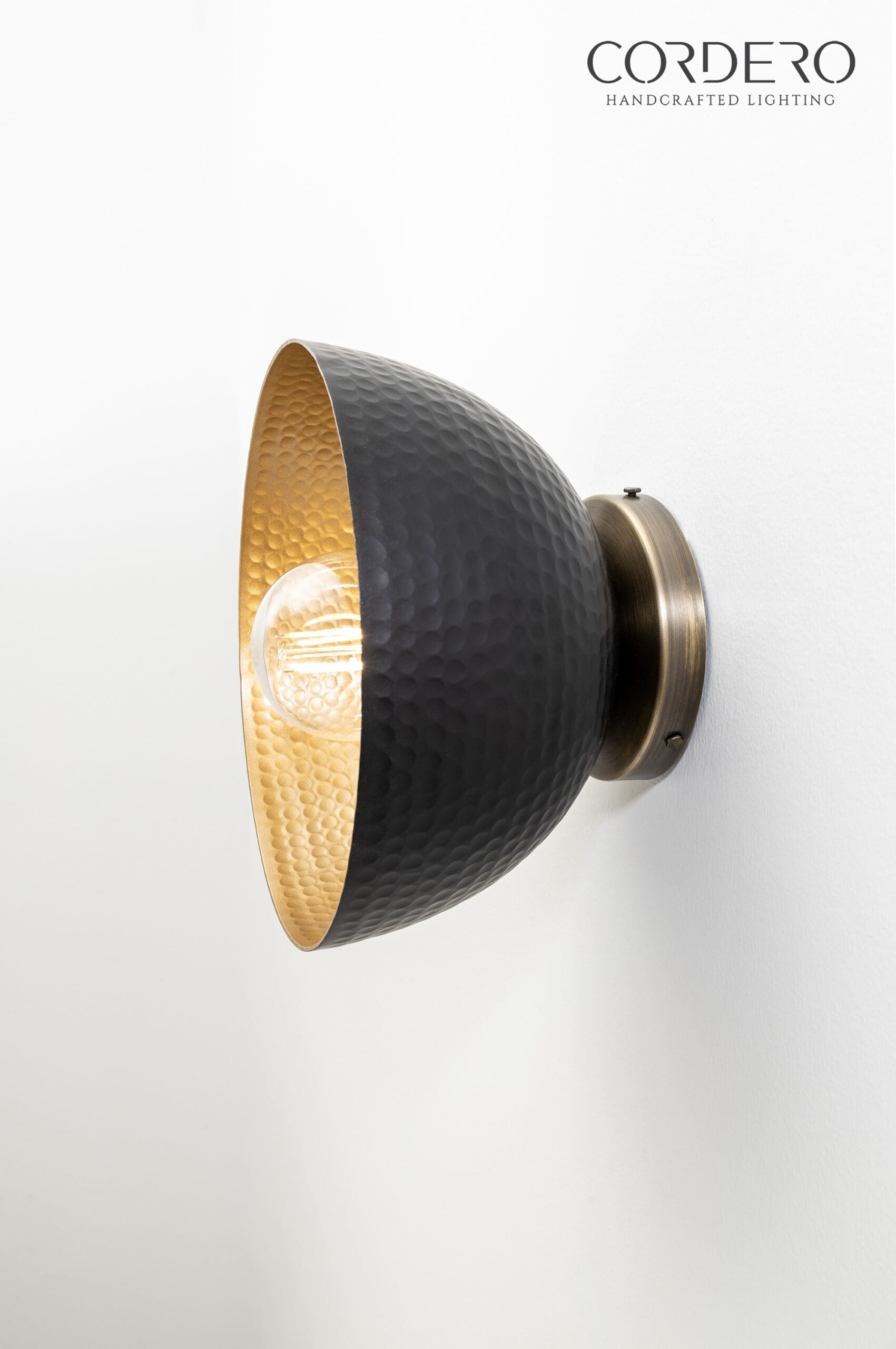 Marked with industrial and contemporary elegance, the Corvo Halo Hammered Dome Sconce bathes your space in luminous sophistication. Whether you’re incorporating simple updates or doing a full remodel, the Corvo Open-Face Hammered Dome Sconce looks as good paired beside bathroom mirrors as it does in framing dining rooms, foyers or bed sides. And the real secret to the Corvo’s stately presence…its incredible range of customizable finishes! From finish options for the brass or steel canopy, the 10” dome interior and exterior finishes and even multiple bulb choices, there’s a style arrangement to energize a wide range of design palates.