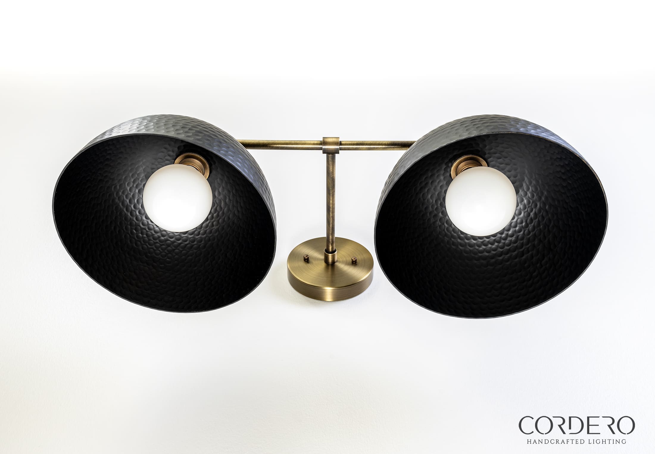 Marked with industrial and contemporary elegance, the Corvo Hammered Double Dome Sconce bathes your space in luminous sophistication. Whether you’re incorporating simple updates or doing a full remodel, the Corvo Hammered Double Dome Sconce looks as good over a bathroom mirror as it does in a home office. And the real secret to the Corvo’s stately presence…its incredible range of customizable finishes! From finish options for the brass or steel supporting rods, the 10” double dome interior and exterior finishes and even three bulb choices, there’s a style arrangement to energize a wide range of design palates.