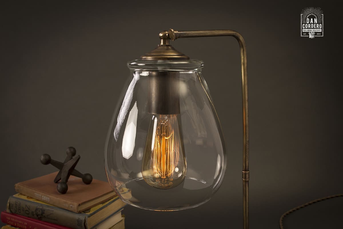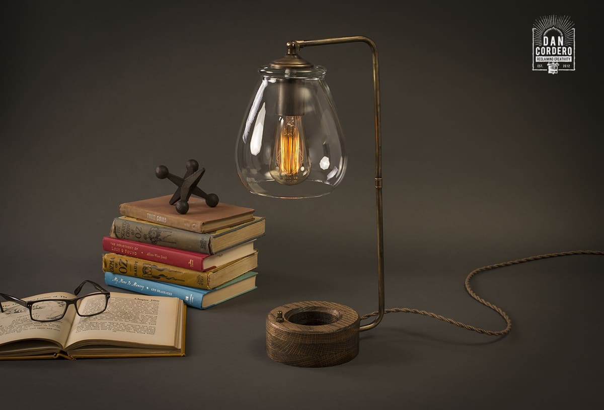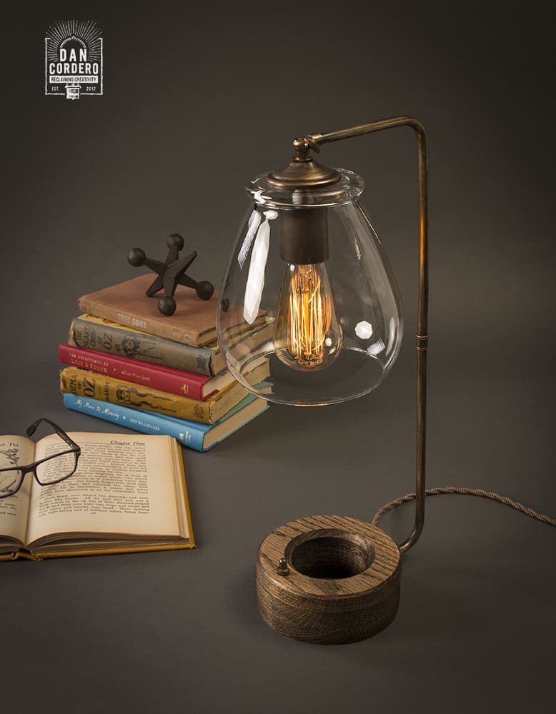 With an eclectic combination of aged brass, Jacobean stained Red Oak wood and vintage braided cording, our hand-made table lamp delivers contemporary industrial charm while radiating a warm sophisticated glow to any space.