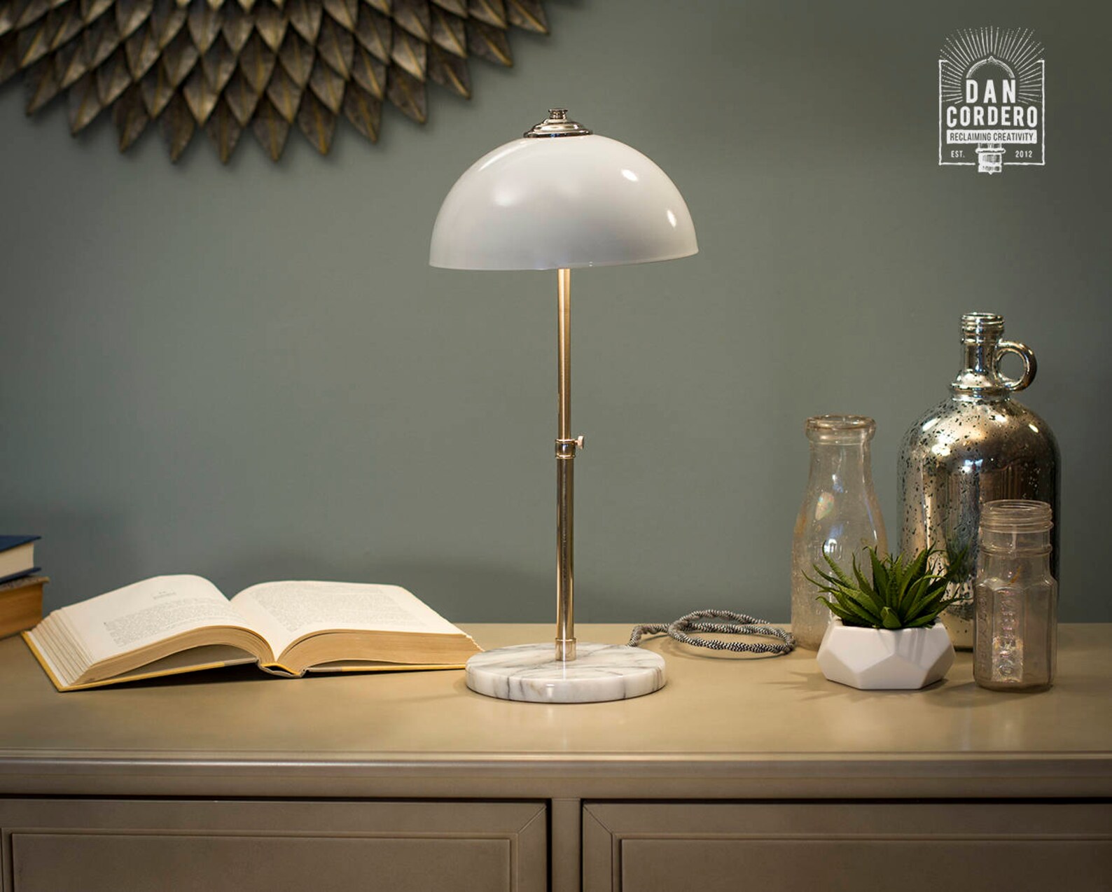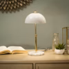 The mix of its gloss white shade and white marble base are in the perfect scale for bedside tables and desks.