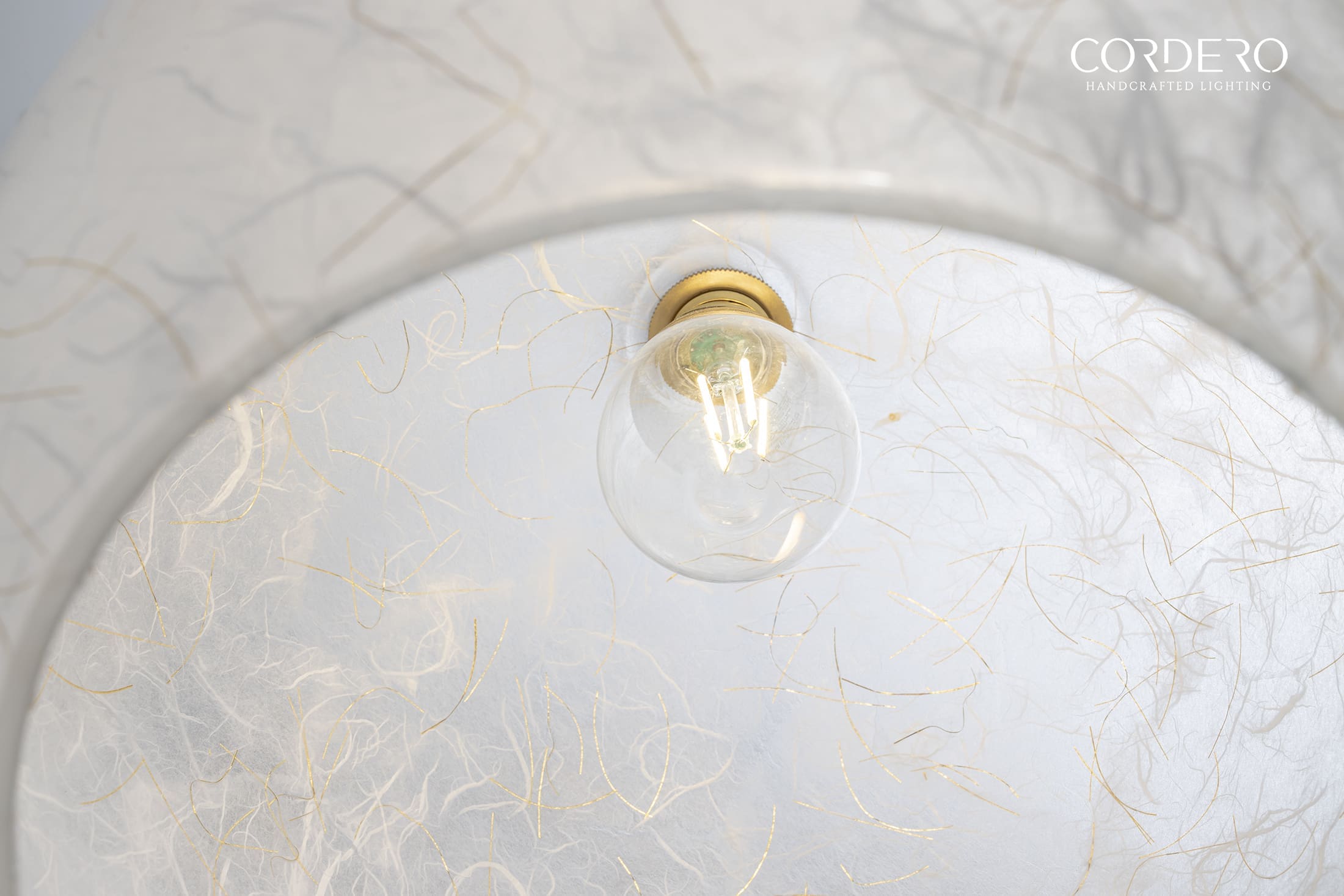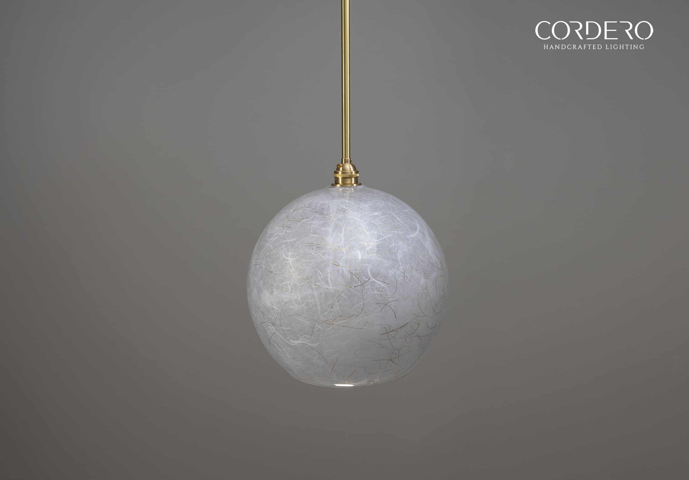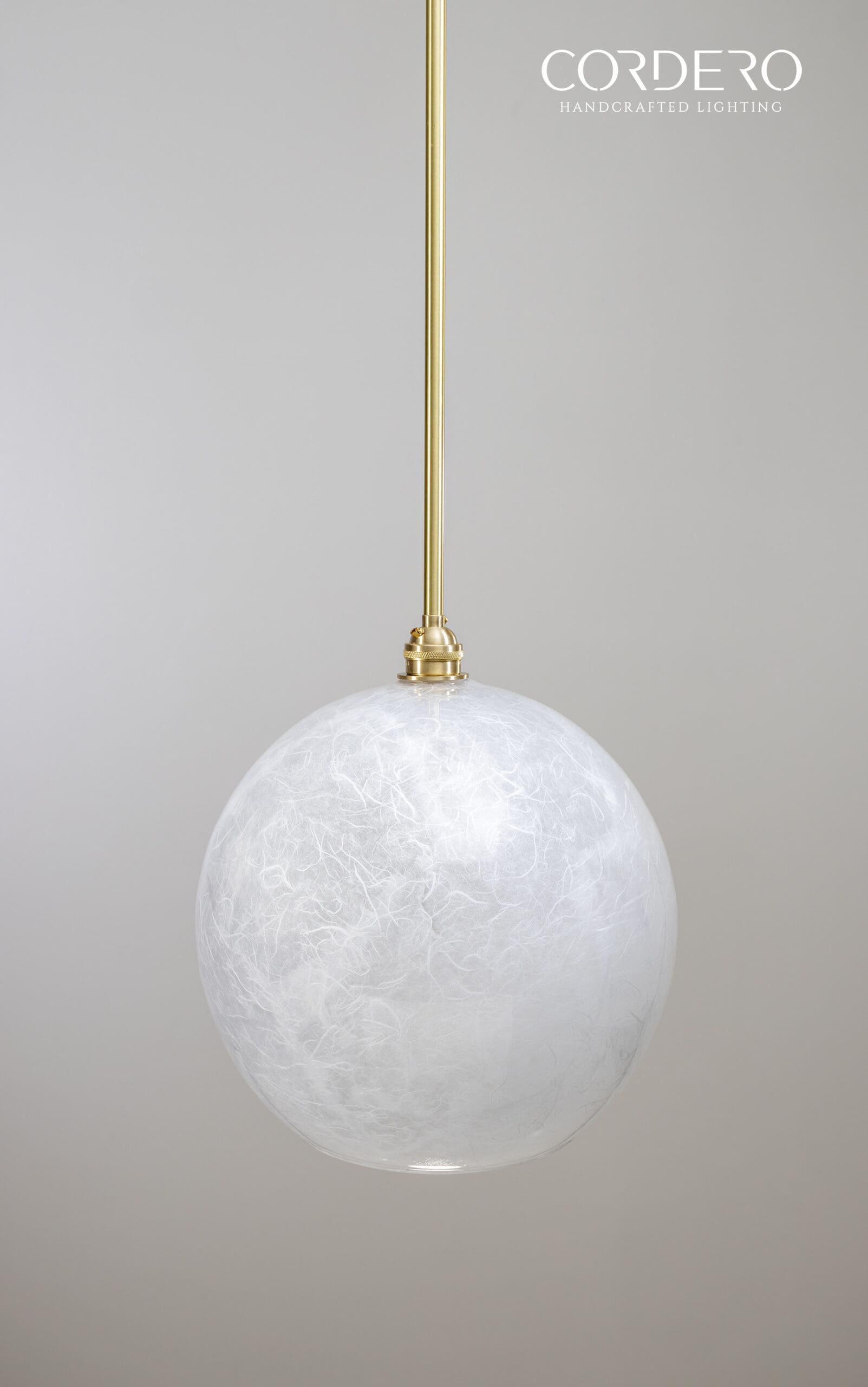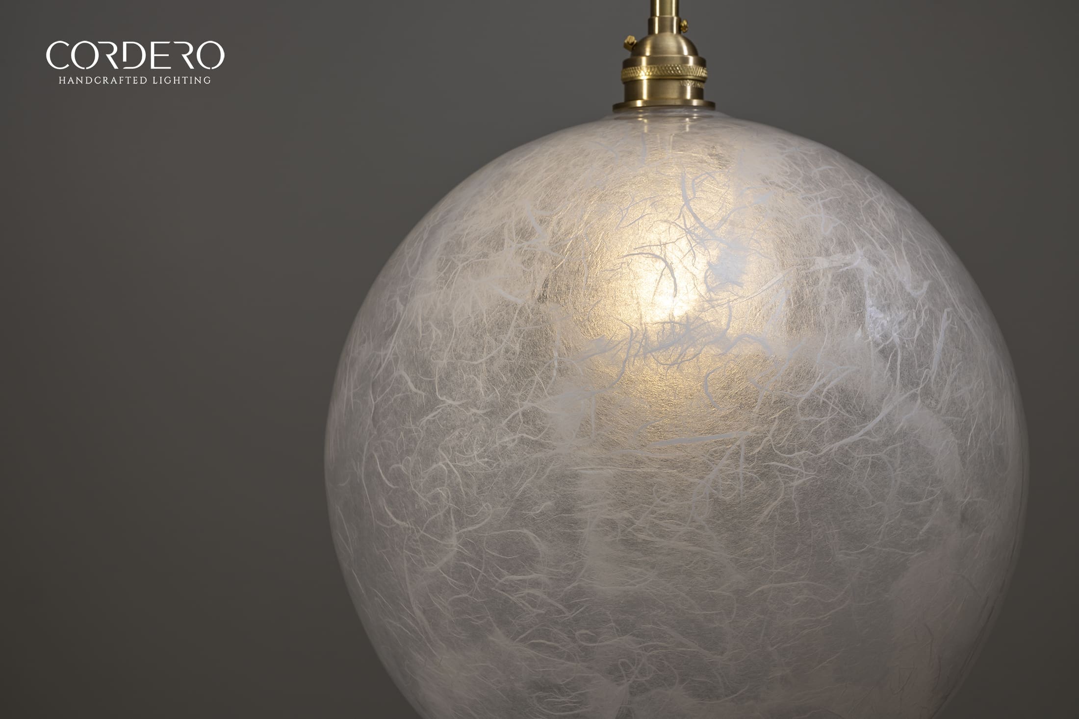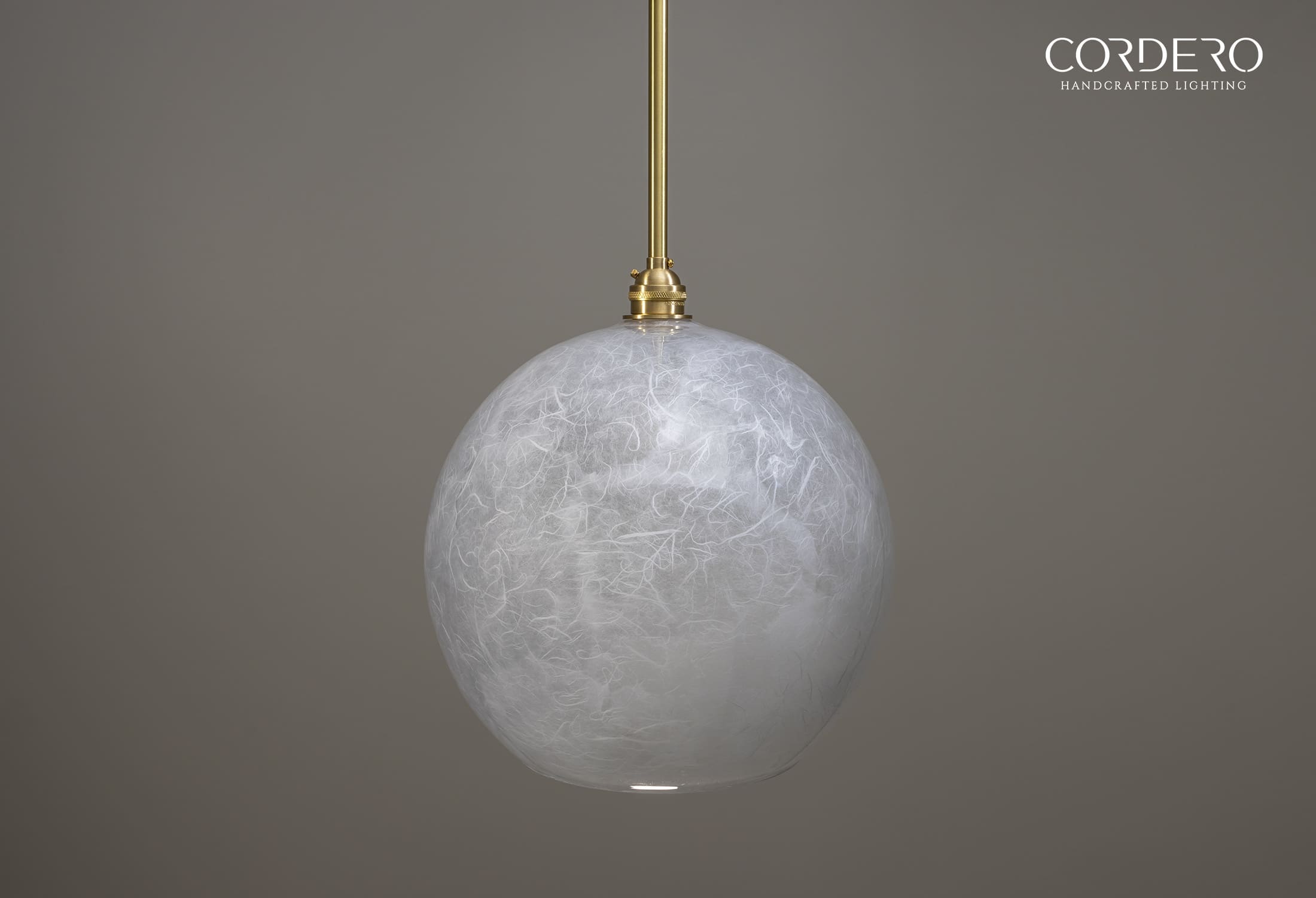 Our handcrafted Solstice Glass Globe Pendant Light combines modern spherically-shaped glass with the ancient art of Hanji handmade paper. The traditional Korean Hanji, arranged from the inner bark of mulberry trees, is a centuries-old practice of creating durable artisanal paper from the mulberry’s long crisscrossed plant fibers. The result is a gorgeous gossamer texture that delicately envelops the curves of the glass globe. With five hardware finishes to choose from as well as a choice of pure white Hanji or white with subtle gold vein, the Solstice Glass Globe Pendant Light radiates a celestial elegance across any home or business.Â