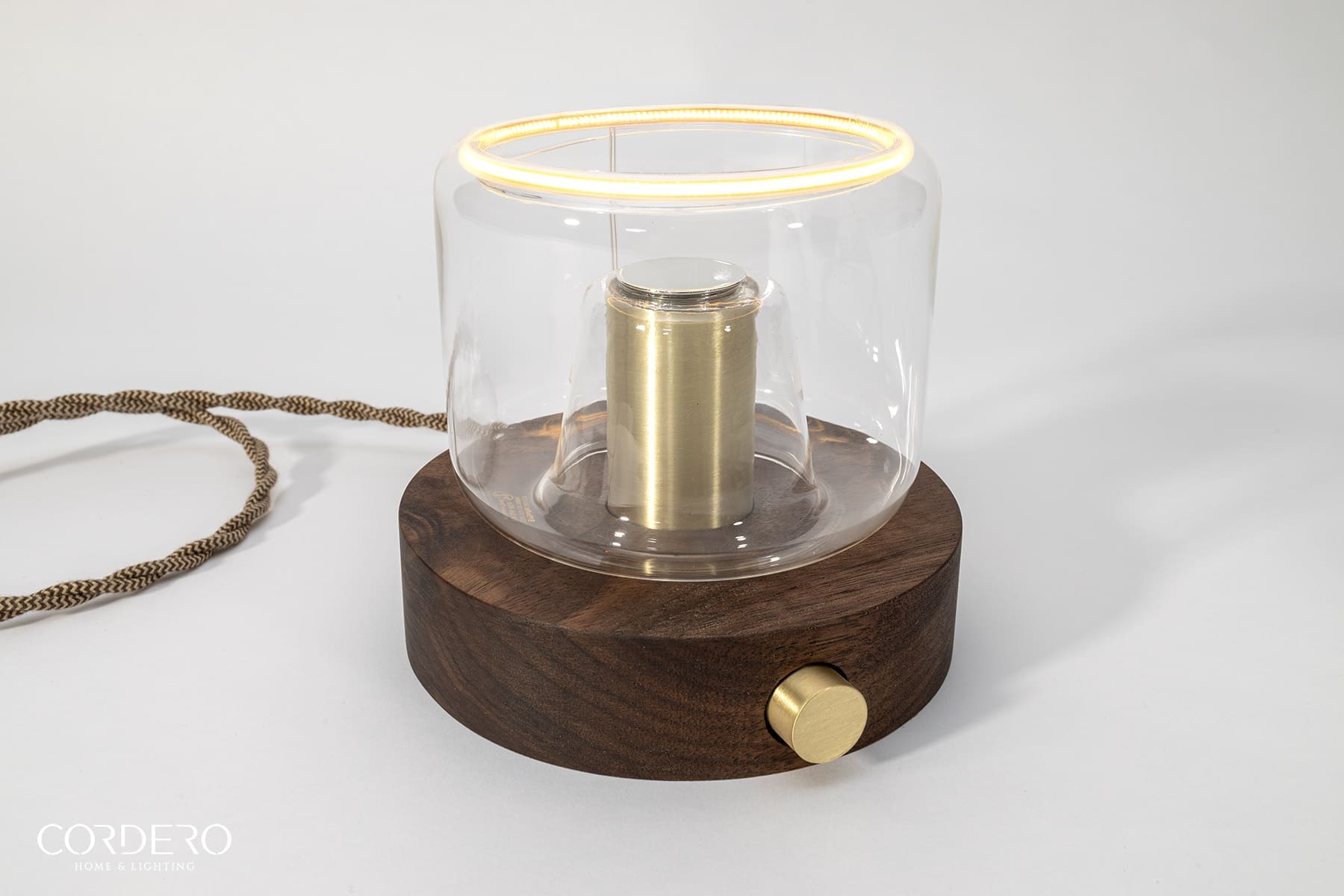 Intentionally scaled for intimacy, the Petite version offers the same sculptural presence in a more compact footprint — ideal for nightstands, shelves, reading corners, and layered lighting compositions. A luminous ring glows from within clear glass, resting effortlessly on a hand-finished 6” walnut base.