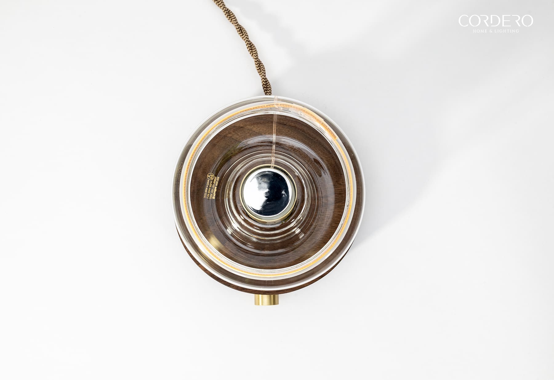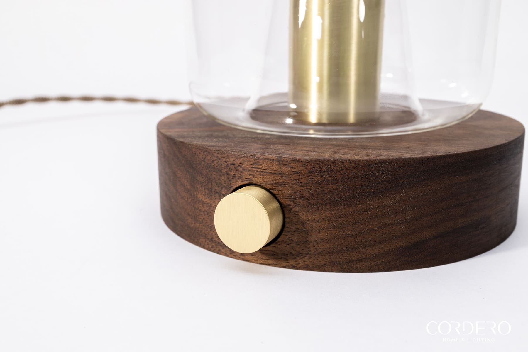 The walnut base is carefully crafted to reveal the richness and depth of the natural grain. Its warmth balances the precision of the glass. Its weight anchors the light. Together, they form a study in contrast — organic yet architectural, minimal yet expressive.