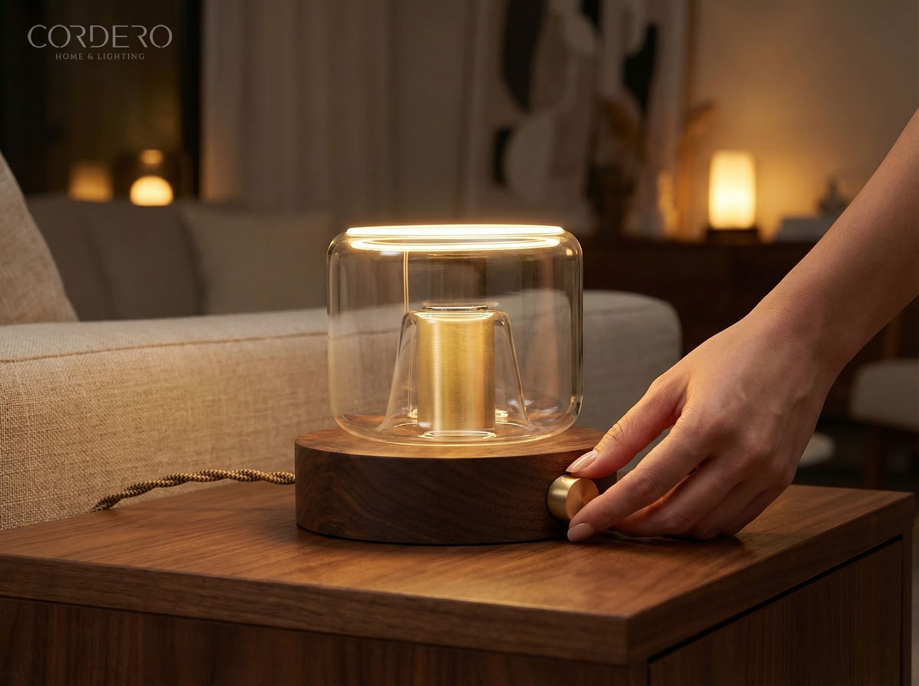 Control is intuitive and discreet. A solid rotary switch on the front of the base offers effortless on/off functionality, while an integrated inline LED dimmer along the cord allows you to shape the ambiance to your exact preference. Set the mood once — then return to it with a simple touch.