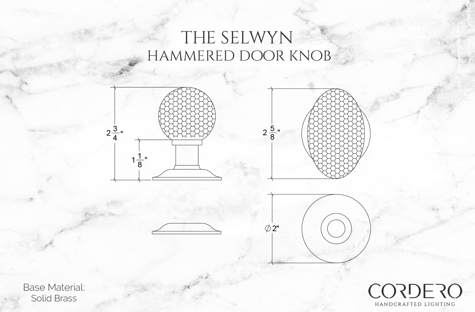 The Selwyn Hammered Door Knob is the ultimate in door “jewelry” with the added benefit of handsome durability for high traffic areas and usage. A combination of strength and beauty, the solid brass hand Hammered Selwyn Door Knob comes in 5 finishes. Mounting hardware is included for easy installation.