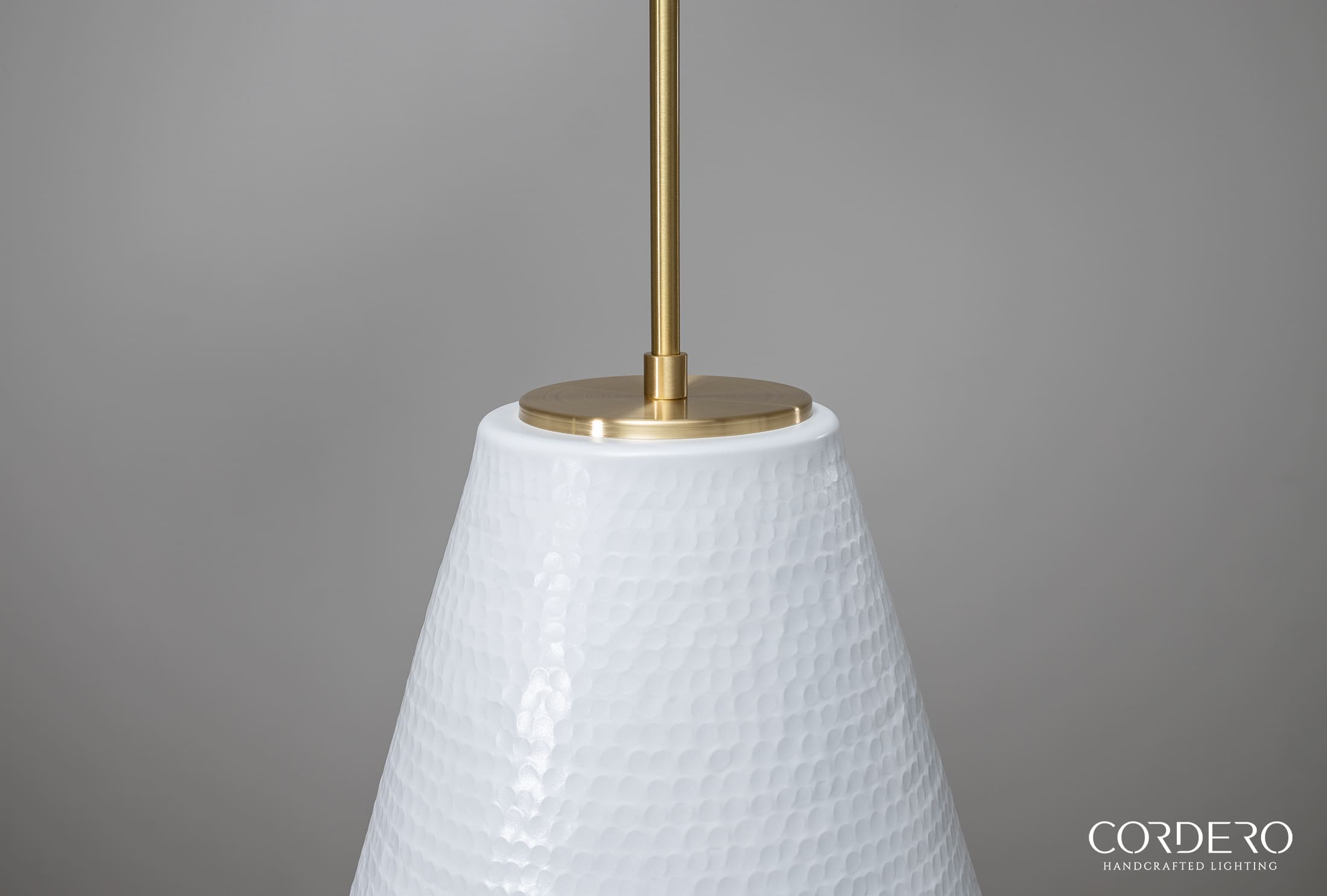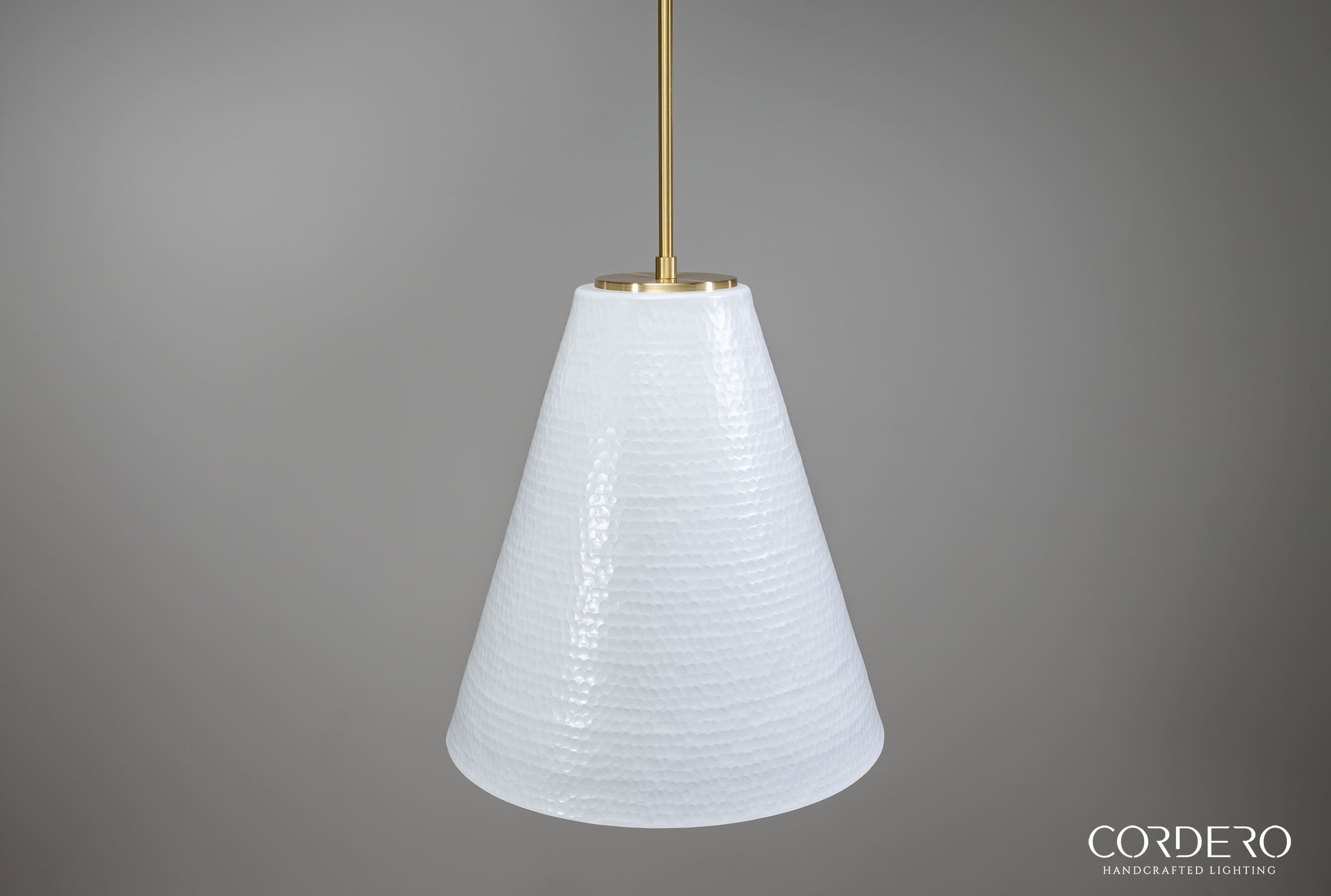 Our handcrafted White Hammered Kinsmore Cone Pendant Light features hundreds of small hand-hammered dimples around an elegant 16” cone-shaped metallic shade. Perfect for displaying solo or in a series, the White Hammered Kinsmore Cone Pendant Light suspends from a handcrafted canopy and metal rod radiating a rich glow over a kitchen island, bar, dining space and more. With over five choices in interior and hardware finishes, the Hammered Kinsmore Cone Pendant Light beautifully complements any home or business space.
