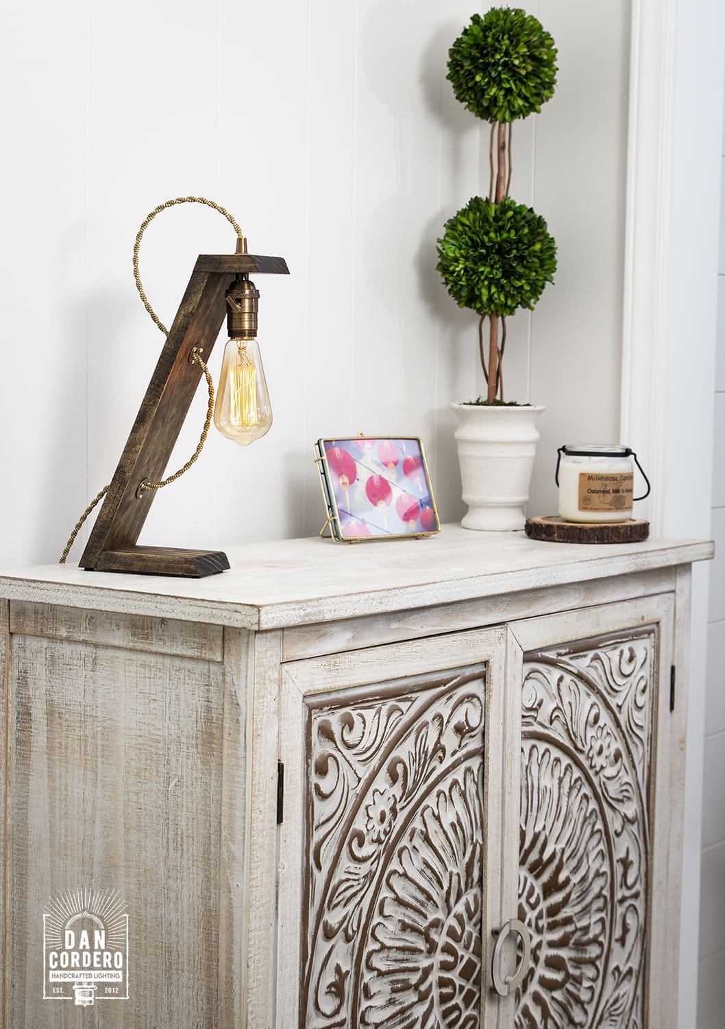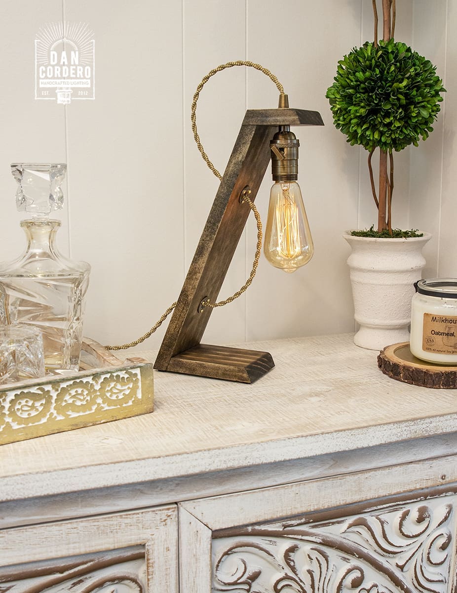 To accentuate the industrial design, I incorporated the antique brass-finished paddle turn knob socket to accompany the central Edison-style filament bulb. Â