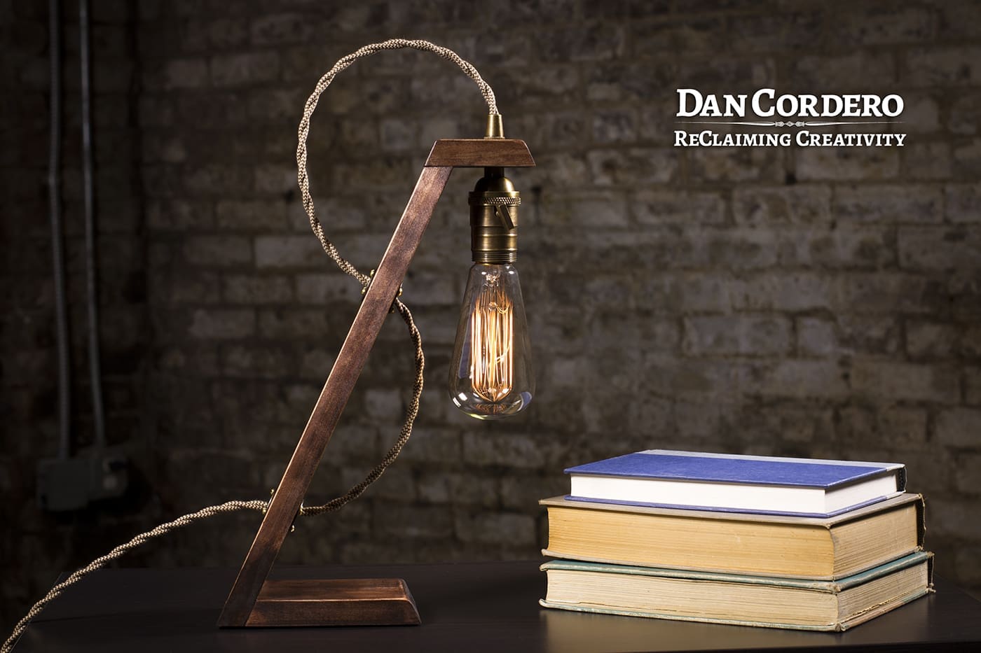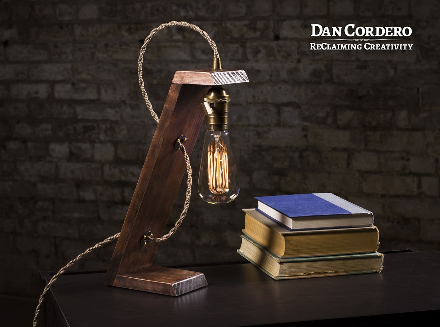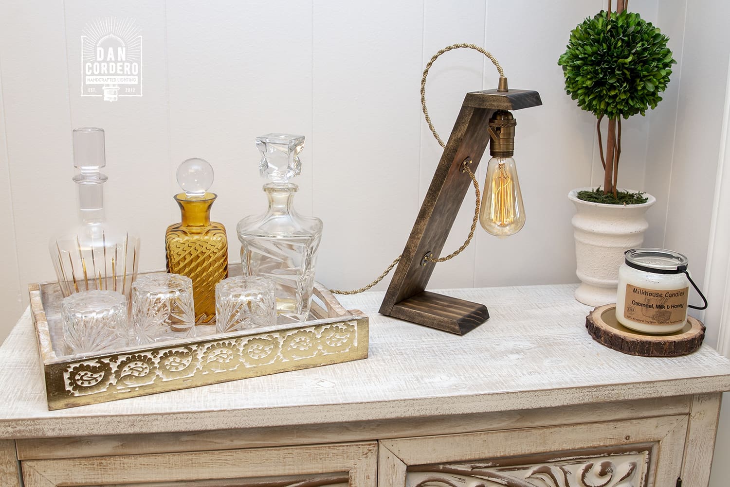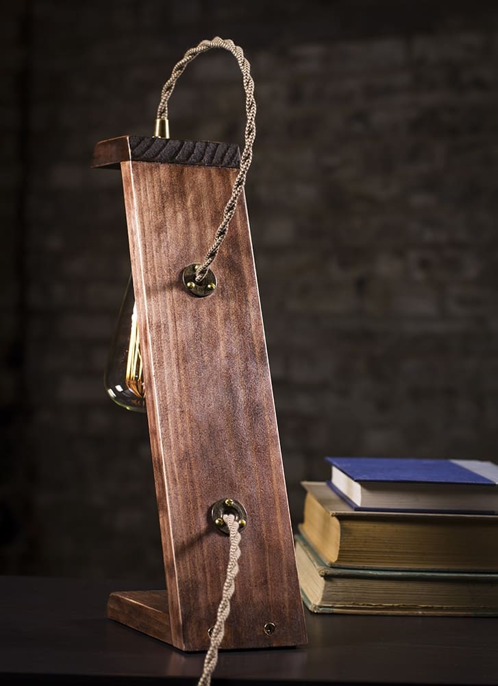 Contemporary meets industrial with this unique handcrafted Wooden Edison Table Lamp, stained a beautiful red mahogany.
